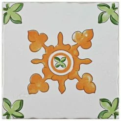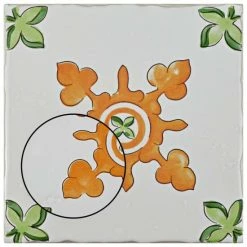 Capture a handcrafted, artisan appearance that seems to have been derived directly from twentieth-century Spain with the 5.125×5.125-inch Nove Centro Paterna Deco Ceramic Wall Tile. Set on a milky white glaze, a centered golden floral hand-painted design is accented by cornering hand-painted dainty leaves. Β Asymmetrical edges and a smooth surface with varying indentations throughout this glossy tile fashion a handmade appearance. Β Due to its partially handmade process, each tile could offer slight size variation. Β This old-world tile is great for acting as a field tile or as an accent for the other items in the Nove program. Intended for interior wall use, this tile is an excellent selection to accent your backsplash, shower wall, fireplace faade or accent wall.