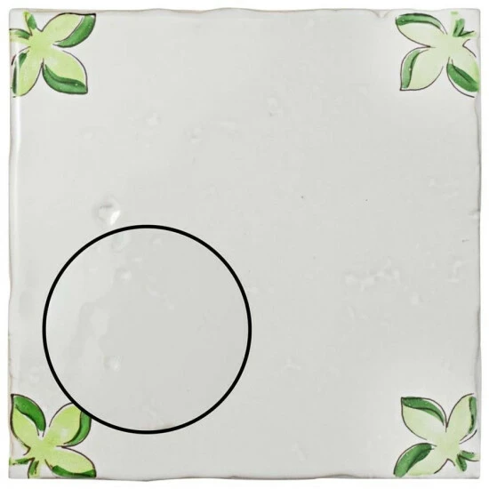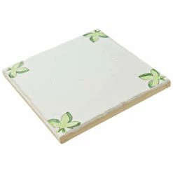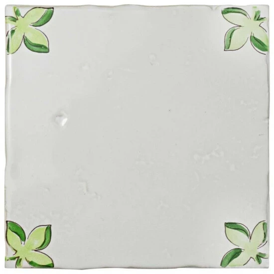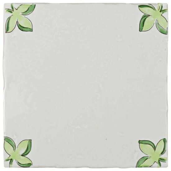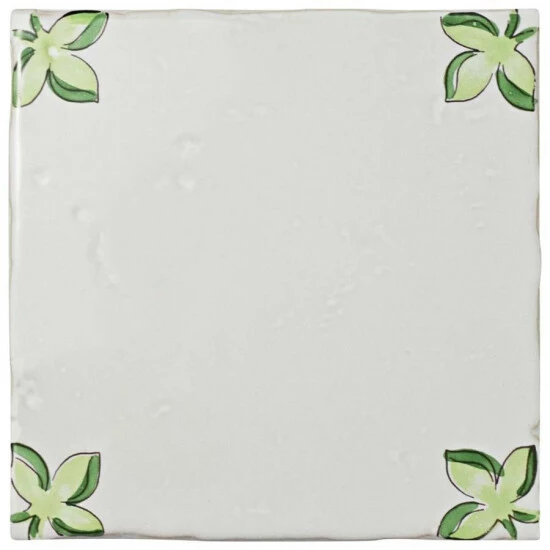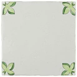 Β Capture a handcrafted, artisan appearance that is inspired by twentieth-century Spain with the Novecento Taco Paterna Deco 5-1/8 in. x 5-1/8 in. Ceramic Wall Tile. Set on a milky white glaze, this square tile features cornering hand-painted dainty leaves. Asymmetrical edges and a smooth surface with varying indentations throughout this glossy trim piece fashion a handmade appearance. Due to its partially handmade process, each tile could offer slight size variation. This old-world tile is great for acting as an accent for the other items in the Novecento program. Intended for interior wall use, this tile is an excellent selection to accent your backsplash, shower wall, fireplace facade or accent wall. Tile is the better choice for your space. This tile is made from natural ingredients, making it a healthy choice as it is free from allergens, VOCs, formaldehyde and PVC.Β