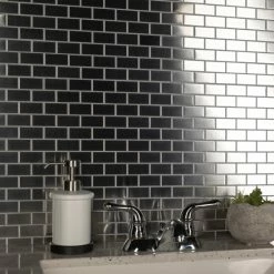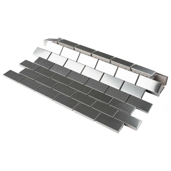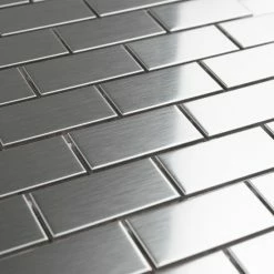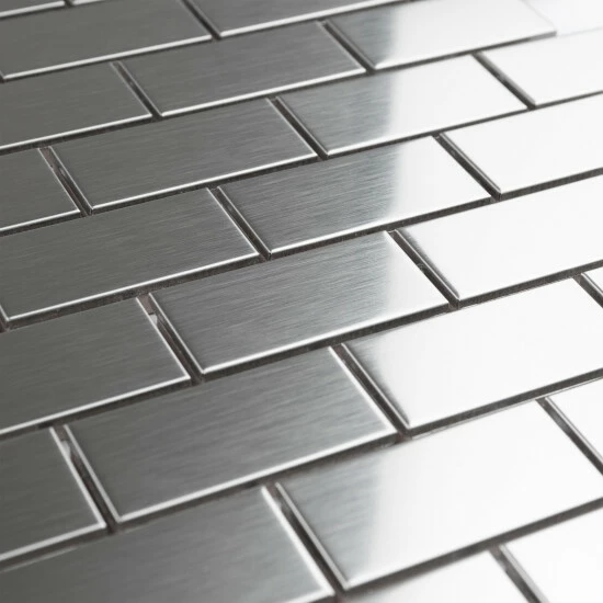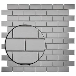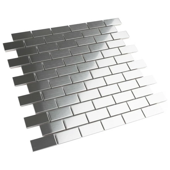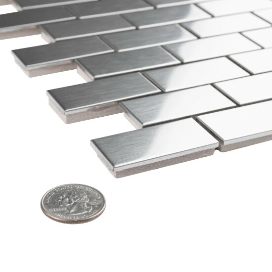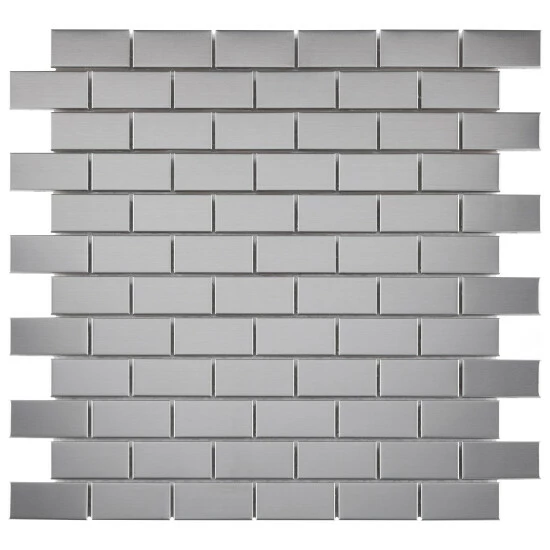 The Merola Tile Alloy Subway 11-3/4 in. x 11-3/4 in. x 8 mm Stainless Steel Over Porcelain Mosaic Tile features a beautiful polished metal veneer over a porcelain body. It creates a stunning tiled effect that has the modern appeal of cool stainless steel. Each individual tile measures 1 in. x 2 in. and is offset at the edges to create an interlocking pattern. Use this tile for indoor wall installations including bathroom walls and backsplashes.Β