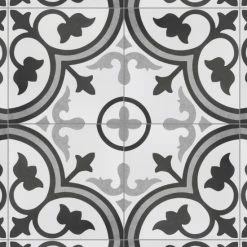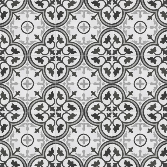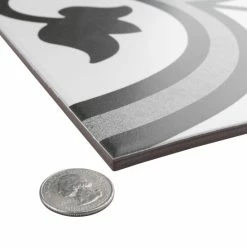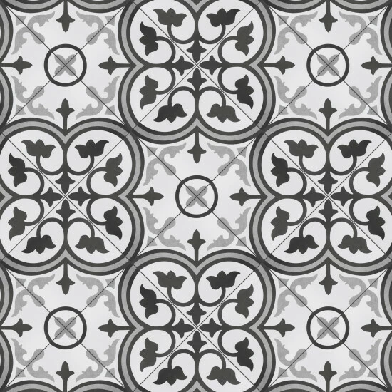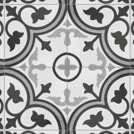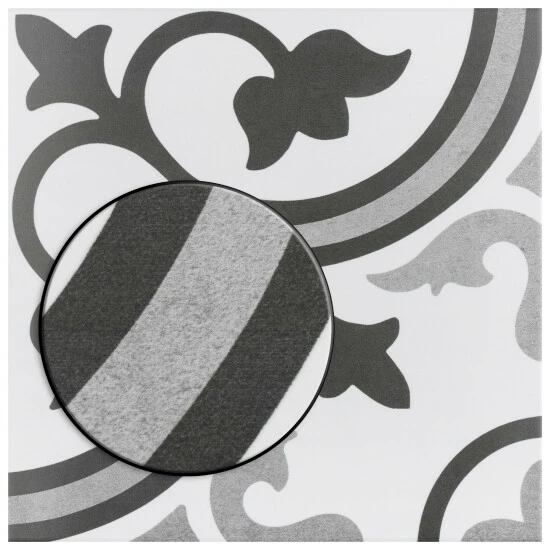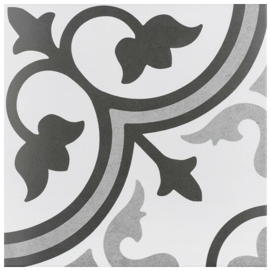 Drawing inspiration from artisan cement tiles, our Amberes Encaustic Ceramic Floor and Wall Tile is a gorgeous tribute to encaustic design. This ceramic tile features a large floral old-world pattern in charcoal grey that frames dueling ash grey arcs in the center, offering subtle contrast and dimension to the decoration. Set on a solid snow white base glaze, the contrasting design features a weathered, speckled look, replicating the beauty of its cement muse. The floral, geometric pattern blends into virtually any design theme, making this an exceptional product for modern installations and historic renovations. Offering a mid-level durability rating, this tile is great for adding a dramatic look to most interiors spaces including showers, kitchens, entryways and backsplashes. Tile is the better choice for your space. This tile is made from natural ingredients, making it a healthy choice as it is free from allergens, VOCs, formaldehyde and PVC.