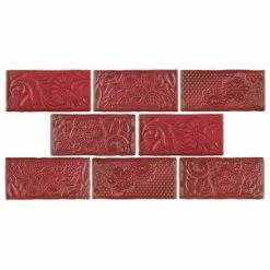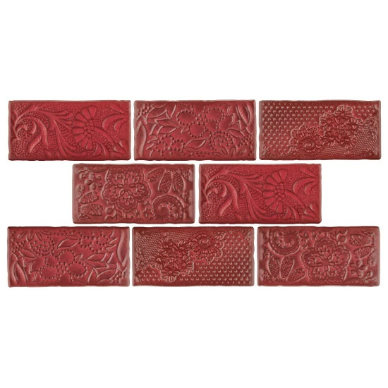 Bring unique vintage accents to your home with the Antic Feelings Red Moon 3 in. x 6 in. Ceramic Subway Wall Tile. These embossed floral subway tiles feature uneven edges for a handmade look. There are up to four varieties of unique floral and lace patterns randomly assorted within the pack for endless design possibilities. The unique coloring, which features variations of vibrant crimson red with brown around the edges, creates a rustic look. These glossy tiles feature a bisque finish that shows the red ceramic on the raised pattern. The reactive glaze on this tile makes every piece unique, so you will never have two that are exactly the same. Use these subway tiles as an accent with many of our other products, including those in the Antic collection, to complete an elegant look.