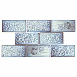 Bring unique vintage accents to your home with the Antic Feelings Via Lactea 3 in. x 6 in. Ceramic Subway Wall Tile. These embossed floral subway tiles feature uneven edges for a handmade look. There are up to four varieties of unique floral and lace patterns for endless design possibilities. The unique pastel coloring, which features varying shades of light blues and gradually darkens to periwinkle and brown around the edges, creates a rustic look. These glossy tiles feature a bisque finish that shows the red ceramic mixed with dark blue on the raised pattern. The reactive glaze on this tile makes every piece unique, so you will never have two that are exactly the same. This reactive glazing technique may cause high variation between dye lots. Please expect variation in color between orders and from what is pictured. Use these subway tiles as an accent with many of our other products, including those in the Antic collection, to complete an elegant look.