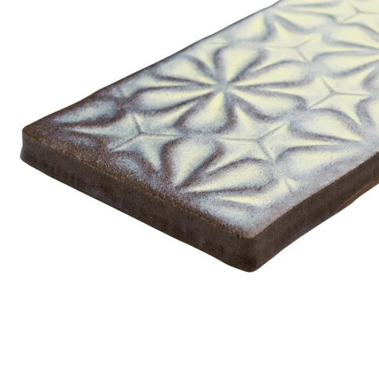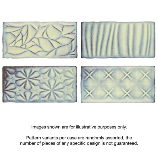 Bring unique modern accents to your home with the Antic Sensations Pergamon 3 in. x 6 in. Ceramic Wall Subway Tile. These embossed floral subway tiles feature uneven edges for a handmade look. There are up to four varieties of unique contemporary geometric patterns randomly assorted within the pack for endless design possibilities. The unique pastel coloring, which features shades of light blue and cream and gradually darkens to periwinkle and brown around the edges, creates a rustic look. These satin tiles feature a bisque finish that shows the red ceramic mixed with shades of blue on the raised pattern. The reactive glaze on this tile makes every piece unique, so you will never have two that are exactly the same. This reactive glazing technique may cause high variation between dye lots. Please expect variation in color between orders and from what is pictured. Use these subway tiles as an accent with many of our other products, including those in the Antic collection, to complete an elegant look.