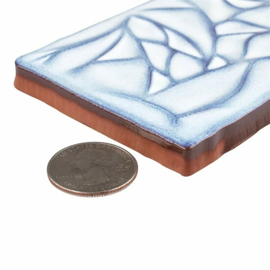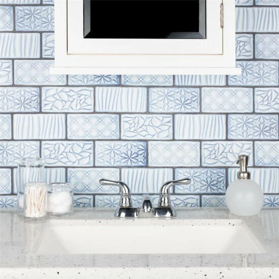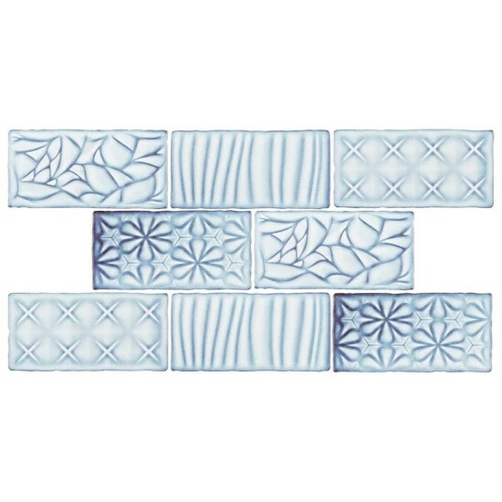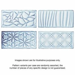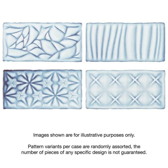 Bring unique vintage accents to your home with the Antic Sensations Via Lactea 3 in. x 6 in. Ceramic Wall Subway Tile. These embossed floral subway tiles feature uneven edges for a handmade look. There are up to four varieties of unique contemporary geometric patterns randomly assorted within the pack for endless design possibilities. The unique pastel coloring, which features varying shades of light blues and gradually darkens to periwinkle and brown around the edges, creates a rustic look. These satin tiles feature a bisque finish that shows the red ceramic mixed with dark blue on the raised pattern. The reactive glaze on this tile makes every piece unique, so you will never have two that are exactly the same. This reactive glazing technique may cause high variation between dye lots. Please expect variation in color between orders and from what is pictured. Use these subway tiles as an accent with many of our other products, including those in the Antic collection, to complete an elegant look.