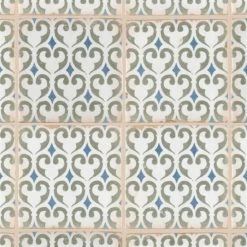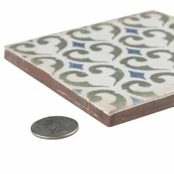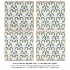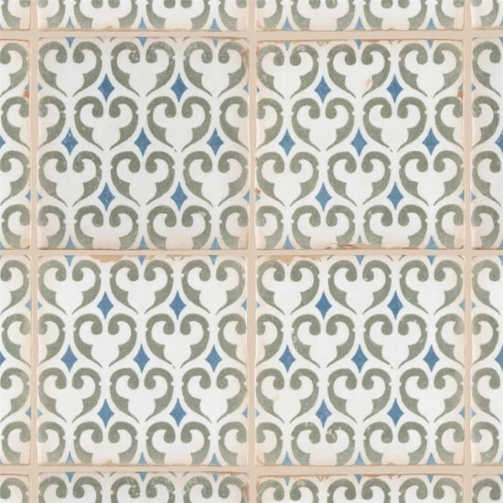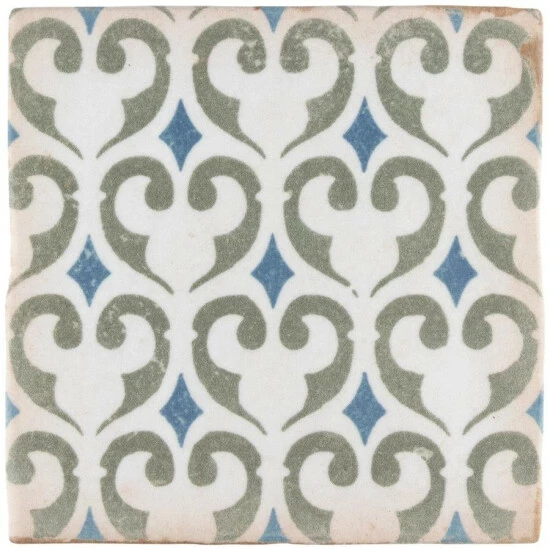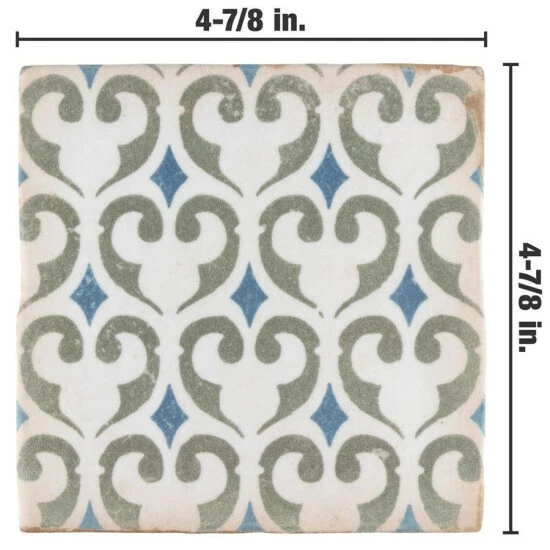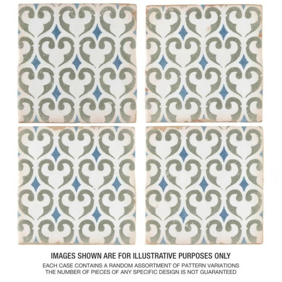 Reflecting the beauty of Spanish culture and design, the Archivo Khazana 4-7/8 in. x 4-7/8 in. Ceramic Floor and Wall Tile transmits the splendor of old-world European elegance. Featuring a buttercream base glaze, warm sepia tones gradually darken the edges for an antiquated look. Deep olive spades are separated by muted denim blue diamonds and create continuity throughout the installation. Imitations of scuffs and spots that are the marks of well-loved, worn, century-old tile bring rustic charm to your interior. Slight undulation throughout the smooth surface and asymmetrical edges convince that this tile is handcrafted. There are 4 different variations available that are randomly scattered throughout each case. With the ability to be paired with the rest of the encaustic-inspired Archivo series, this tile can also make a governing statement on its own. Use this robust tile in most interior settings, including kitchens, foyers, fireplaces and some commercial settings. Reminder: Each case contains a random mix of tiles. The mix may not contain all 4 variations.