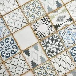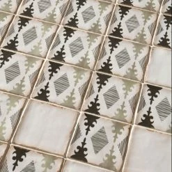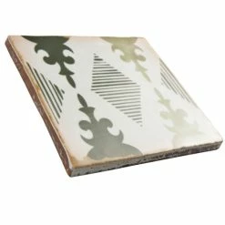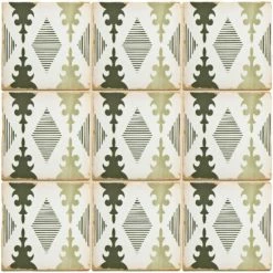 Reflecting the beauty of Spanish culture and design, the Archivo Mandir 4-7/8 in. x 4-7/8 in. Ceramic Floor and Wall Tile transmits the splendor of old-world European elegance. Featuring a buttercream base glaze, warm sepia tones gradually darken the edges for an antiquated look. Flourishing light sage green and deep olive green designs accent the centering deep olive green-striped diamonds blend to create continuity throughout the installation. Imitations of scuffs and spots that are the marks of well-loved, worn, century-old tile bring rustic charm to your interior. Slight undulation throughout the smooth surface and asymmetrical edges convince that this tile is handcrafted. There are 4 different variations available that are randomly scattered throughout each case. With the ability to be paired with the rest of the encaustic-inspired Archivo series, this tile can also make a governing statement on its own. Use this robust tile in most interior settings, including kitchens, foyers, fireplaces and some commercial settings. Reminder: Each case contains a random mix of tiles. The mix may not contain all 4 variations.
