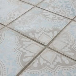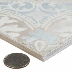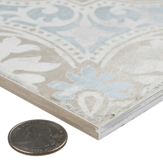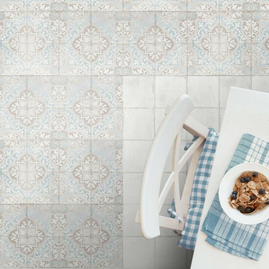 Modern and vintage design elements blend together to create our Barcelona Decor Montjuic 5-3/4 in. x 5-3/4 in. Porcelain Floor and Wall Tile. Featuring a worn cement appearance, this tile is a subtle statement piece created by floral motifs in faded pastel shades of light blue, beige and brown set on a textured antique white base glaze. With a delicate color palette and realistic imitations of scuffs and spots, this encaustic inspired tile evokes a loved, worn and century-old appearance with a chic modern edge. Available in six print variations that are randomly scattered throughout each case, the variation throughout each tile mimics an authentic aged appearance. Its impervious, frost-resistant and durable features make this tile and ideal choice for both indoor and outdoor commercial and residential installations including, backsplashes, kitchens, bathrooms, showers, entryways and patios. This tile is a perfect choice on its own or paired with other products in the Barcelona Collection. Tile is the better choice for your space. This tile is made from natural ingredients, making it a healthy choice as it is free from allergens, VOCs, formaldehyde and PVC.