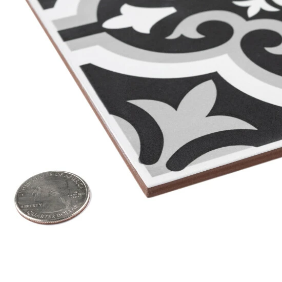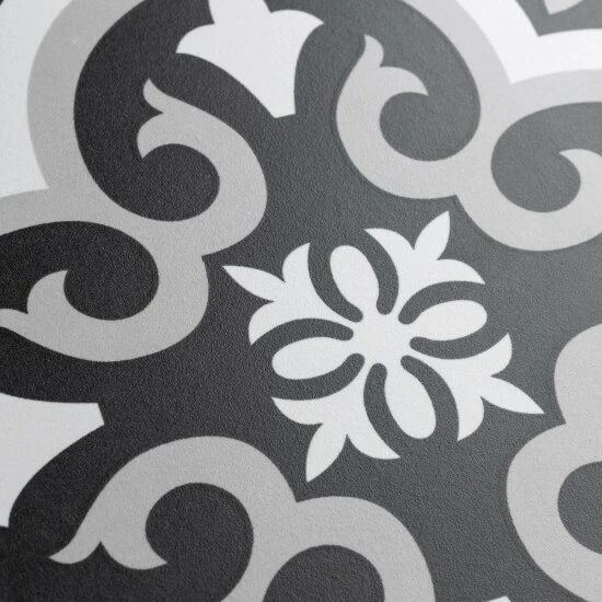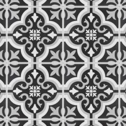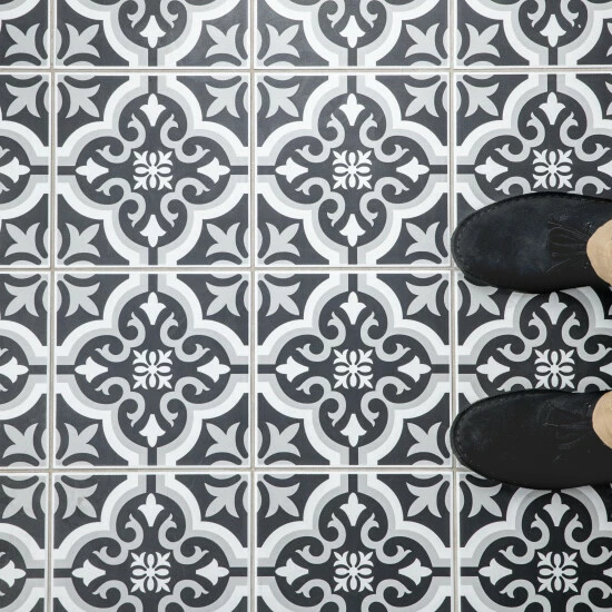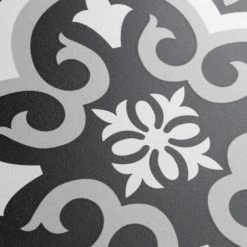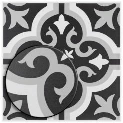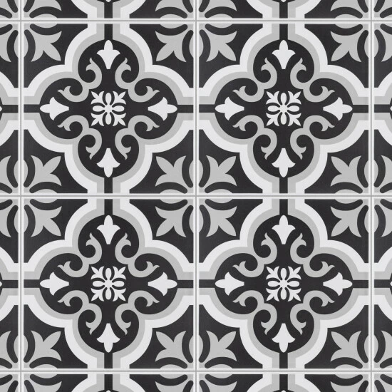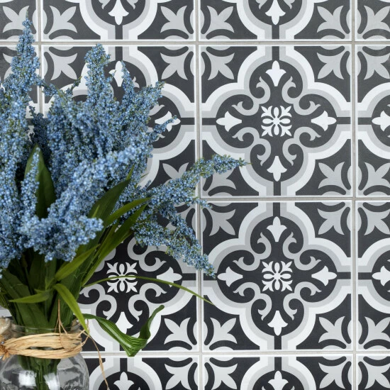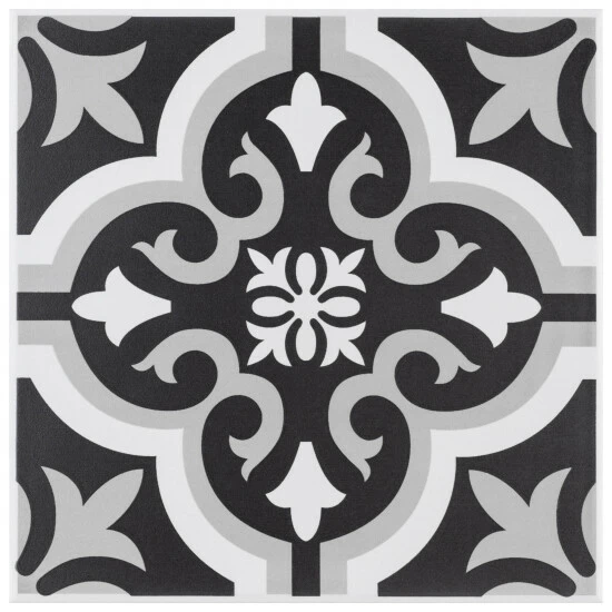 The Braga Classic II Encaustic 7-3/4 in. x 7-3/4 in. Ceramic Floor and Wall Tile stunningly captures the artisanal look of ceramic tile. This matte tile flooring features a fleur-de-lis white and ash gray design over a black background, offering artistic beauty within its pattern. Ideal for low-traffic interior applications, such as in a powder room, this durable ceramic flooring is moderately textured for slip resistance.