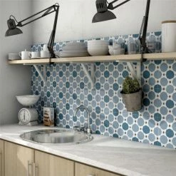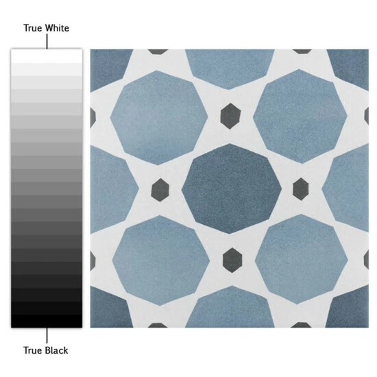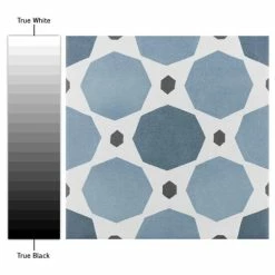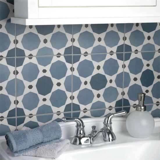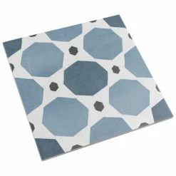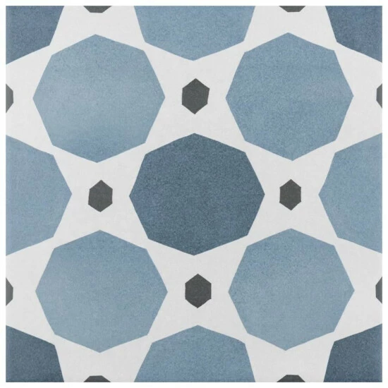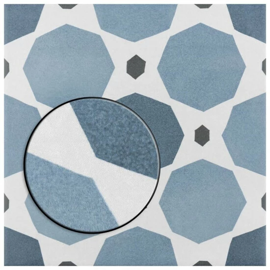 Achieve patterned elegance with the Caprice Colours Sapphire Encaustic 7-7/8 in. x 7-7/8 in. Porcelain Floor and Wall Tile. This tile features dueling denim blue octagons are accented with smaller black hexagons. Overall, the patterns evoke a hand painted look. Great for bringing an encaustic look to the home, this slightly textured tile has a matte glazed finish. Durable and frost resistant, this tile is great for any residential location, including entryways, kitchens, showers and patios. It also has a slip-resistant surface, making it safe for wet locations.