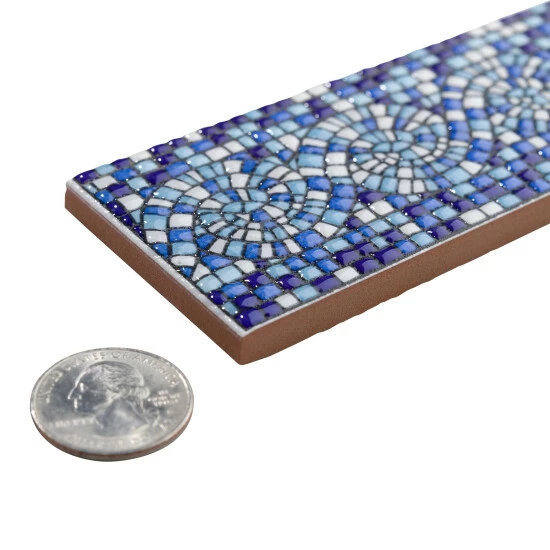 Our Captain Riptide Pacific Blue Ceramic Wall Trim Tile is the perfect coastal inspired accent for any space. Crafted in Spain, this tile features a mosaic-like design depicting rolling wave patterns in light blue and white tones with an embossed, glossy finish. Intended for indoor wall use, this tile is an ideal choice for backsplashes, bathrooms, showers, and kitchens. Tile is the better choice for your space. This tile is made from natural ingredients, making it a healthy choice as it is free from allergens, VOCs, formaldehyde, and PVC.