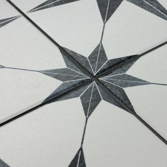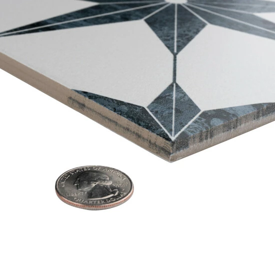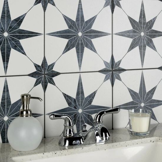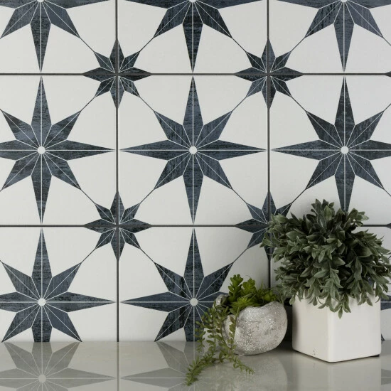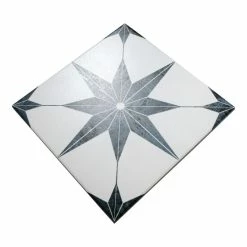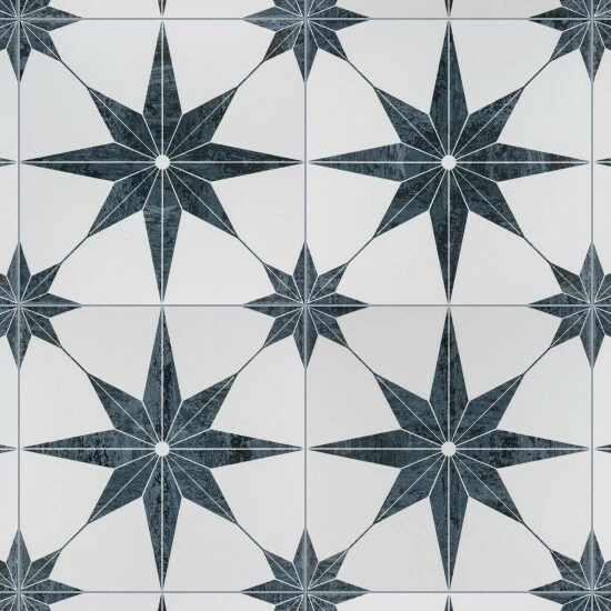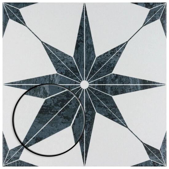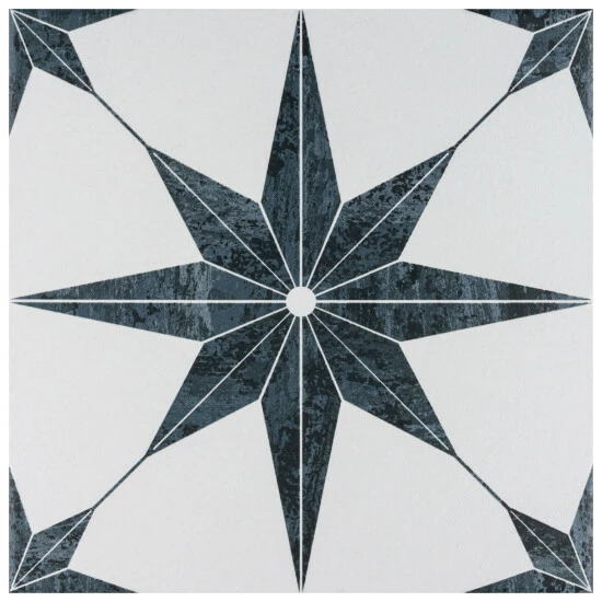 Blending texture and pattern, our Cassis Stella Black 9-3/4″ x 9-3/4″ Porcelain Floor and Wall Tile mimics the natural appearance of distressed wood and timeless old-world beauty. This square porcelain tile features a large geometric star pattern in faded charcoal black wood tones. Composed of rich detail and a textured, mixed finish surface, this floor and wall tile features stunningly realistic woodgrains and striations for additional visual dimension. Available in 10 print variations that are randomly scattered throughout each case, this porcelain tile can be laid out in various different patterns to create a truly unique installation. Its impervious and frost-resistant features make this an ideal choice for indoor and outdoor residential installations including, including backsplashes, bathroom floors and walls, showers, kitchen floors and walls, fireplaces and patios. Tile is the better choice for your space. This tile is made from natural ingredients, making it a healthy choice as it is free from allergens, VOCs, formaldehyde and PVC.