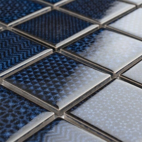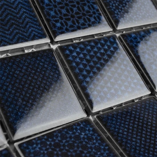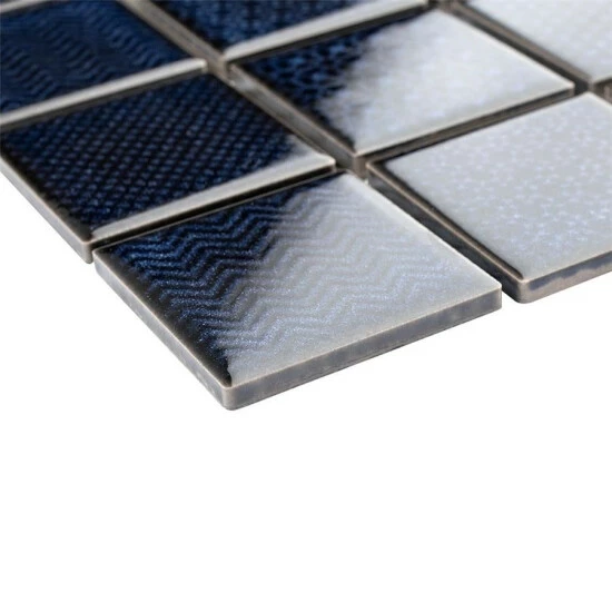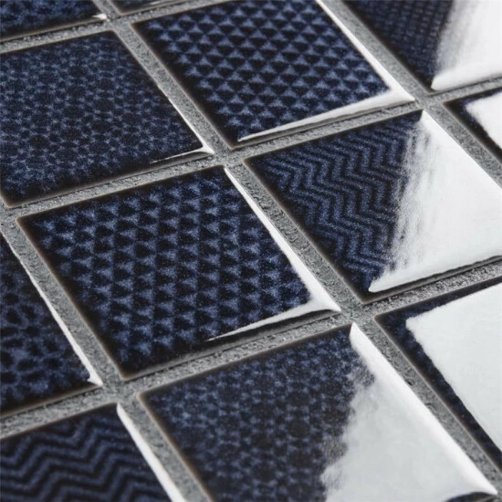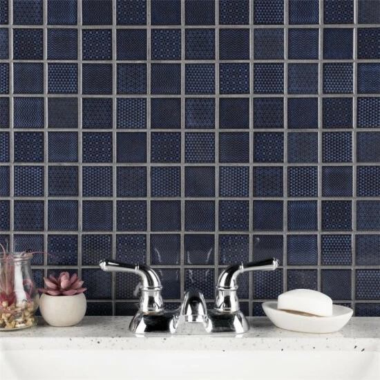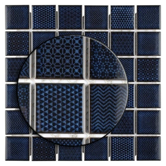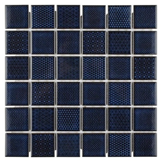 The Celadon Royal 11-3/4 in. x 11-3/4 in. Porcelain Mosaic Tile features varying shades of deep midnight and navy blue for an elegant industrial appeal. This tile includes individual square pieces that each have various geometric and chevron patterns to create one unique mosaic sheet that is available in five print variations randomly scattered throughout each case. An illusion of additional depth and dimension is created by a smooth and sleek glossy surface, which provides a stunning design. Its impervious and frost-resistant features make this an ideal tile for indoor and outdoor floor and wall installations. Tile is the better choice for your space. This tile is made from natural ingredients, making it a healthy choice as it is free from allergens, VOCs, formaldehyde and PVC.