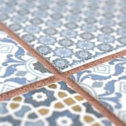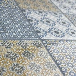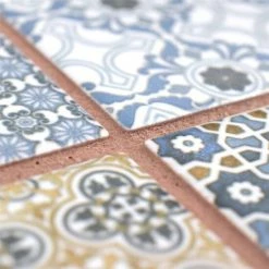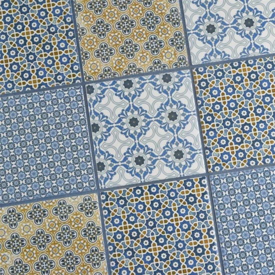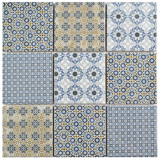 The Classico 12 in. x 12 in. Porcelain Mosaic Tile ties together the intricate look of individual tiles with the easy installation of a mosaic. This patchwork mosaic features four varying old-world designs that have white and goldenrod accents with shades of denim, stone and dark sky blue. This rustic piece brings the feel of Spanish tile to any room in the home. The strong mesh backing material makes for easy installation and the durable porcelain material and impervious water absorption rating make this mosaic a great choice for indoor and outdoor applications.