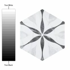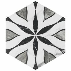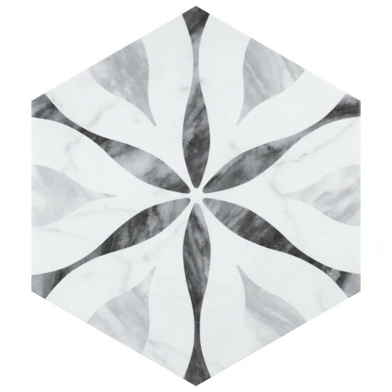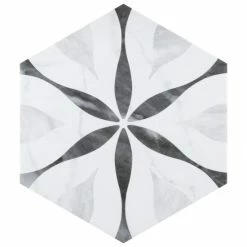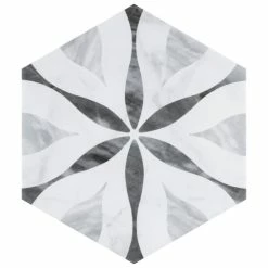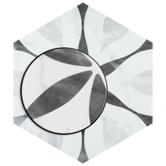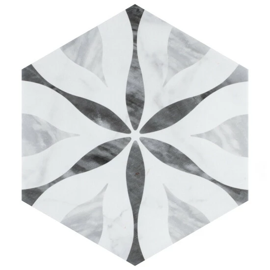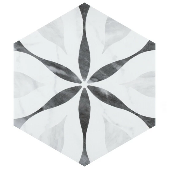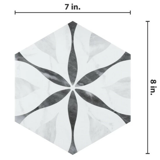 Emulating the timeless beauty of Bardiglio marble, the Classico Bardiglio Hexagon Flower 7 in. x 8 in. Porcelain Floor and Wall Tile captures stunning artistry dating back to Ancient Rome. Set on a satin white glaze, this marbleized porcelain tile offers an everlasting look for any traditional or contemporary installation. Light and dark grey veining striations sporadically flow throughout, adding authenticity to your space. The main feature of this tile is the monochrome, smooth curves that create a centered, dark flower and subtle fluid lanterns. With a traditional hexagon format and smooth, ever so slightly undulated surface, this tile is perfect for creating a sophisticated feel for any setting. There is variation in the veining patterns found throughout each tile. Pair this tile with other Classico products to complete your own elegant installation. Tile is the better choice for your space. This tile is made from natural ingredients, making it a healthy choice as it is free from allergens, VOCs, formaldehyde and PVC.