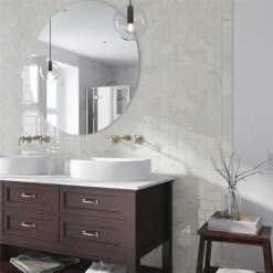 Emulating the timeless beauty of Carrara marble, the Classico Carrara Glossy Bullnose 3″ x 6″ Ceramic Wall Trim Tile captures stunning artistry dating back to Ancient Rome. Set on a glossy white glaze, this marbleized ceramic tile offers an everlasting look to accent your wall installation. Light grey veining striations sporadically flow throughout this trim piece, adding authenticity to your installation. With a traditional subway format and a 6″ rounded finished edge, this tile is perfect for finishing your wall installation. There is variation in the veining patterns found throughout each tile. Pair this tile with other Classico Carrara products to complete your own elegant installation. Tile is the better choice for your space. This tile is made from natural ingredients, making it a healthy choice as it is free from allergens, VOCs, formaldehyde and PVC.