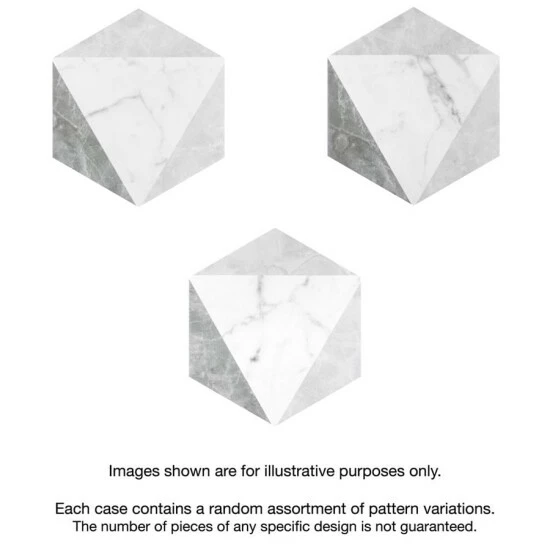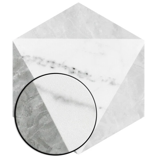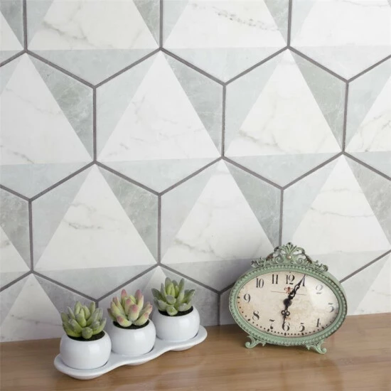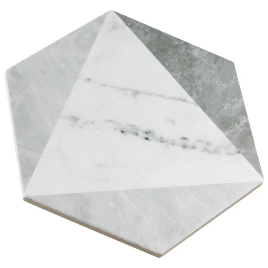 Enjoy the look of marble at an affordable price with the Classico Carrara Hexagon Peak 7 in. x 8 in. Porcelain Floor and Wall Tile. Designed to have the appearance of Carrara marble, it features a marbleized centered geometric design with sharp angles in assorted shades of grey with muted green undertones. This hexagonal tile is ideal for both historical renovations and new construction. Durable and slip resistant, it’s an excellent choice for most residential floors, including kitchens, showers and entryways. Use this tile alone or mix and match it with the coordinating patterned options for a unique result.