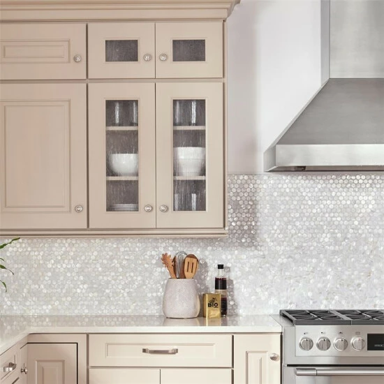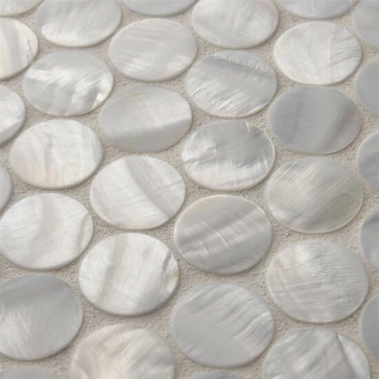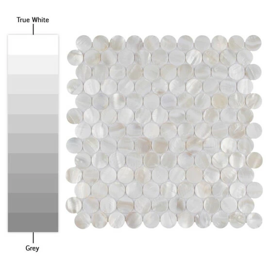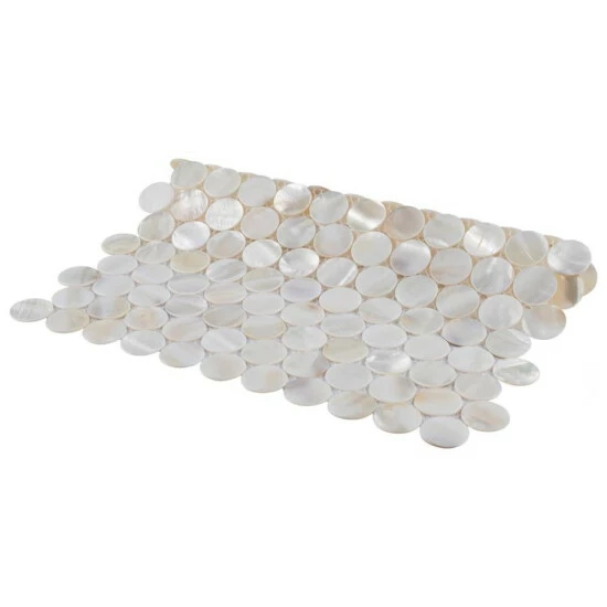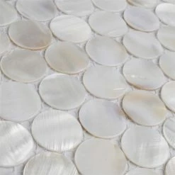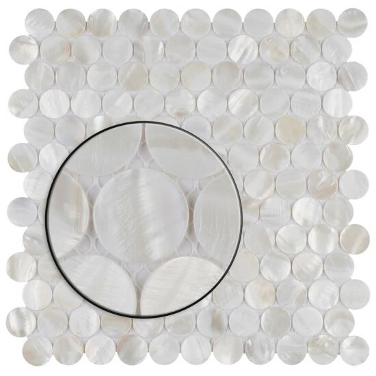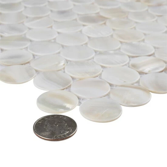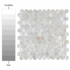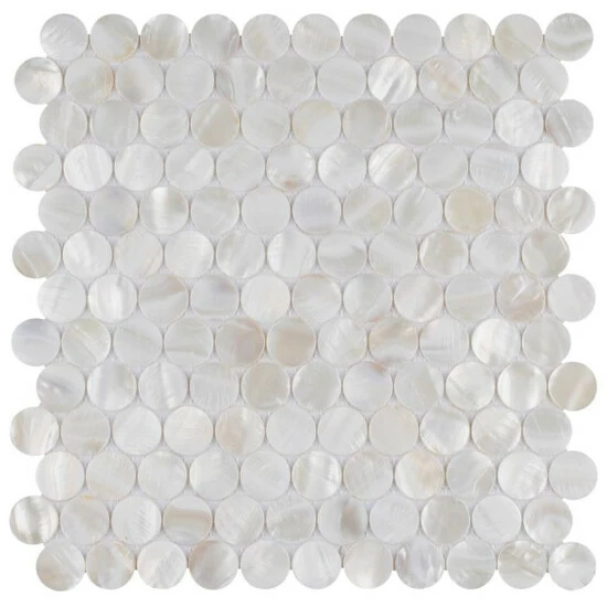 Capturing the lustrous beauty of natural seashells, our Conchella Penny White 11-1/4″ x 11-5/8″ Natural Seashell Mosaic Wall Tile emulates seaside-inspired tranquility. Featuring an exquisite blend of beautifully iridescent penny shaped chips that are constructed of natural seashells, this mosaic wall tile illuminates any space. Soft white and beige tones infuses this tile with elegance and natural charm. Smooth, glossy penny rounds are precisely arranged on an interlocking mesh to create a seamless installation. This minimalistic geometric porcelain mosaic is unique yet simplistic enough to integrate into any design, ranging from traditional style renovations to modern home projects. Its impervious and frost resistant features make this mosaic an ideal choice for both indoor and outdoor wall installations including, kitchen backsplashes, bathroom showers and fireplace facades. This tile is a perfect choice on its own or paired with other products in the Conchella Collection. Tile is the better choice for your space. This tile is made from natural ingredients, making it a healthy choice as it is free from allergens, VOCs, formaldehyde and PVC.