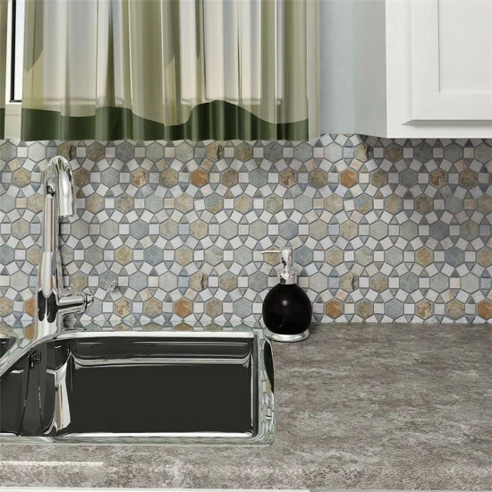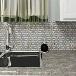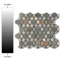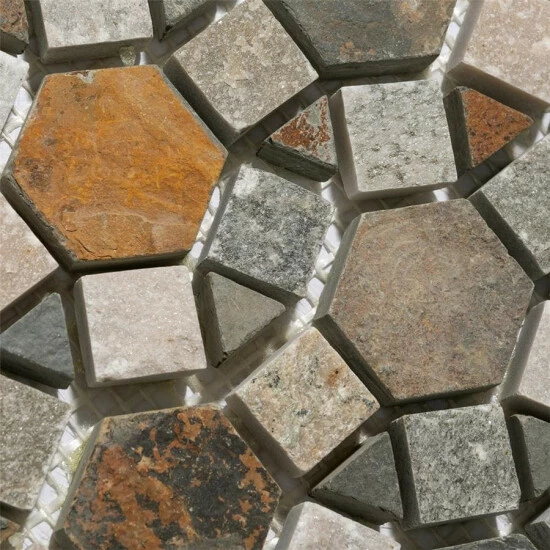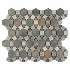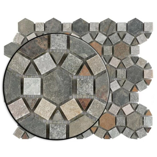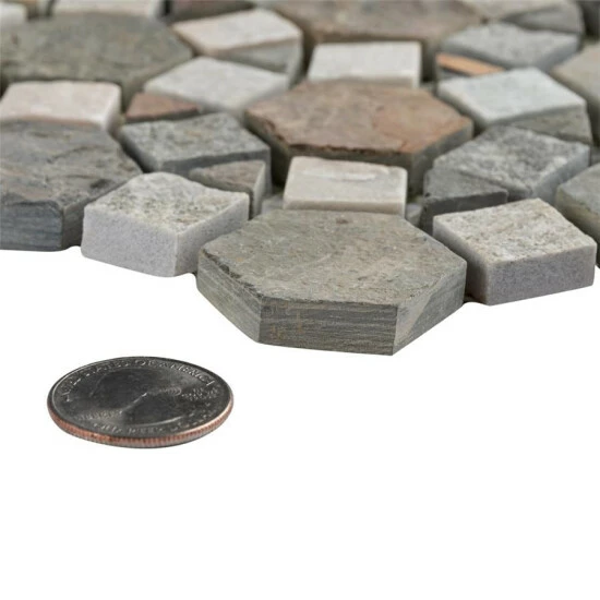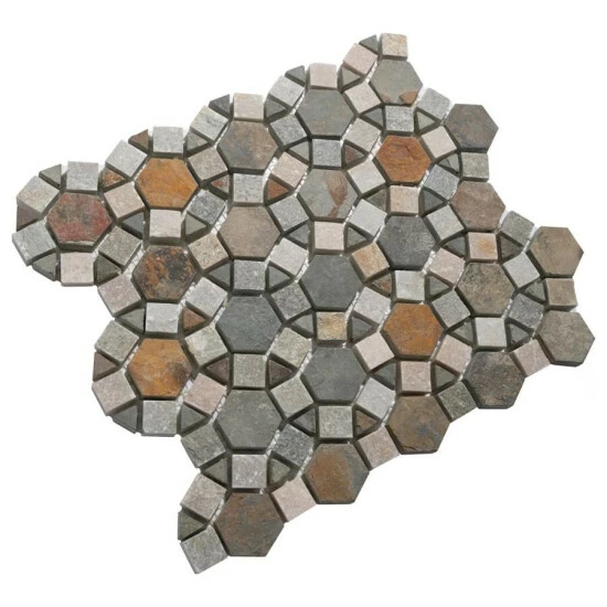 The Crag Aztec Multi Sunset 10-1/4 in. x 11-1/4 in. x 9 mm Slate Mosaic Tile brings together the organic and the man-made. This blend of natural stone is laid out in a fascinating circular pattern, with dark gray pieces contrasting with ash gray pieces with pink, rust and tan striations. The wide range of color found in these natural stones makes it optimal for just about any Decor. This tile is impervious to water and frost resistant, ideal for bathrooms, backsplashes and exterior work.