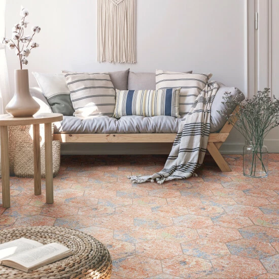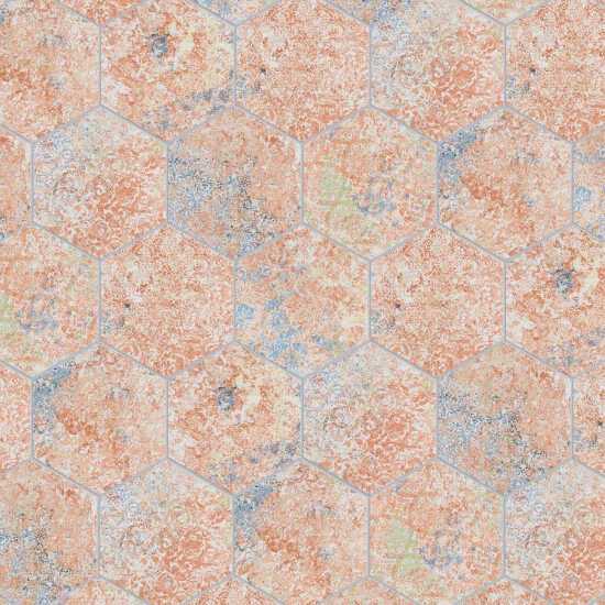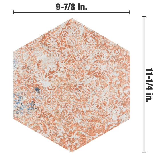 Mimicking a worn cement appearance with subtle textile designs, our Emotion Hex Red Porcelain floor and Wall Tile offers decorative vintage charm. This hexagon tile features delicate floral motifs that are complemented by weathered pattern variations in vibrant red, yellow, blue, and green tones. With a slightly textured, satin finish, this cement-look porcelain tile blends into virtually any design theme, ranging from contemporary projects to traditional installations. Available in thirty print variations that are randomly scattered throughout each case, the variation throughout each tile mimics an authentic aged appearance. Its impervious, frost-resistant, and durable features make this an ideal choice for indoor and outdoor commercial and residential installations including kitchens, bathrooms, backsplashes, showers, hallways, entryways, and patios. Tile is the better choice for your space. This tile is made from natural ingredients, making it a healthy choice as it is free from allergens, VOCs, formaldehyde, and PVC.