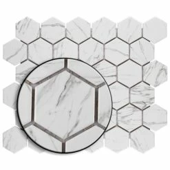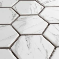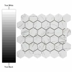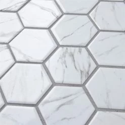 Emulating the timeless beauty of marble in an easy to maintain material, our Flo 2 in. Hex White 11 in. x 12-Β½ in. Porcelain Mosaic Floor and Wall Tile brings functional sophistication into any living space. This marble alternative offers an innovative twist to classic elegance with a modern hexagon mosaic design. Marbleized hexagonal chips are arranged on an interlocking mesh to create a seamless installation. Set on a smooth, glossy white base glaze, each mosaic is complemented with light and dark grey veining striations that sporadically flow throughout each piece for added authenticity. This minimalist geometric porcelain mosaic is unique yet simplistic enough to integrate into any design, ranging from traditional style renovations to modern home projects. Its impervious and frost-resistant features make this an ideal tile for both indoor and outdoor residential use, including backsplashes, bathrooms, showers and kitchens. Tile is the better choice for your space. This tile is made from natural ingredients, making it a healthy choice as it is free from allergens, VOCs, formaldehyde and PVC.