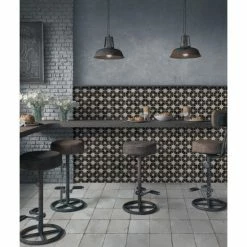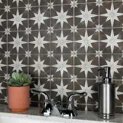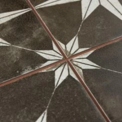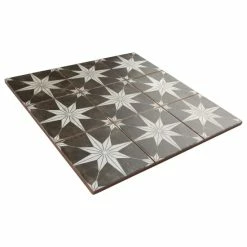 Our Harmonia Kings Star Night 13 in. x 13 in. Ceramic Floor and Wall Tile creates the look of a stunning leading-edge mosaic-like design with the harmonious, easy installation of a square tile. Inspired by our best-selling Kings Star Night this ceramic encaustic-inspired tile similarly features a unique, low-sheen glaze in faded charcoal black tones with centered antique white star patterns in each square. With realistic imitations and scuffs and spots that are the marks of well-loved, worn, century-old tile, this floor and wall tile is a true reflection of vintage industrial design. These scuffs and spots convince that this tile is truly aged, bringing rustic charm to any interior setting. Save time and labor spent arranging mosaic sheets and instead install these durable ceramic slabs, which have squares separated by scored grout lines. The scored grout lines can be grouted with the color of your choice to further customize your installation. Its glazed and durable features make it an ideal choice for both commercial and residential indoor installations including kitchens, bathrooms, showers, and entryways. Tile is the better choice for your space. This tile is made from natural ingredients, making it a healthy choice as it is free from allergens, VOCs, formaldehyde and PVC.