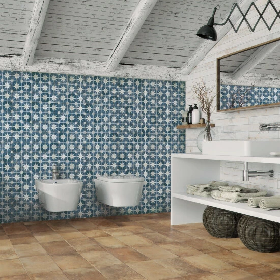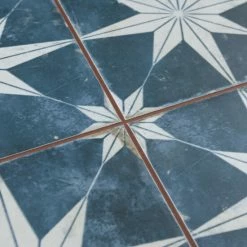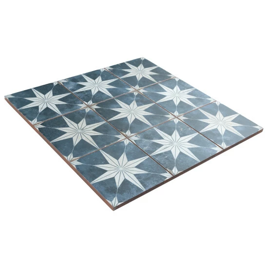 Our Harmonia Kings Star Sky 13 in. x 13 in. Ceramic Floor and Wall Tile creates the look of a stunning leading-edge mosaic-like design with the harmonious, easy installation of a square tile. Inspired by our best-selling Kings Star Sky, this ceramic encaustic-inspired tile similarly features a unique, low-sheen glaze in faded denim blue tones with centered antique white star patterns in each square. With realistic imitations and scuffs and spots that are the marks of well-loved, worn, century-old tile, this floor and wall tile is a true reflection of vintage industrial design. These scuffs and spots convince that this tile is truly aged, bringing rustic charm to any interior setting. Save time and labor spent arranging mosaic sheets and instead install these durable ceramic slabs, which have squares separated by scored grout lines. The scored grout lines can be grouted with the color of your choice to further customize your installation. Its glazed and durable features make it an ideal choice for both commercial and residential indoor installations including kitchens, bathrooms, backsplashes, showers, and entryways. Tile is the better choice for your space. This tile is made from natural ingredients, making it a healthy choice as it is free from allergens, VOCs, formaldehyde and PVC.