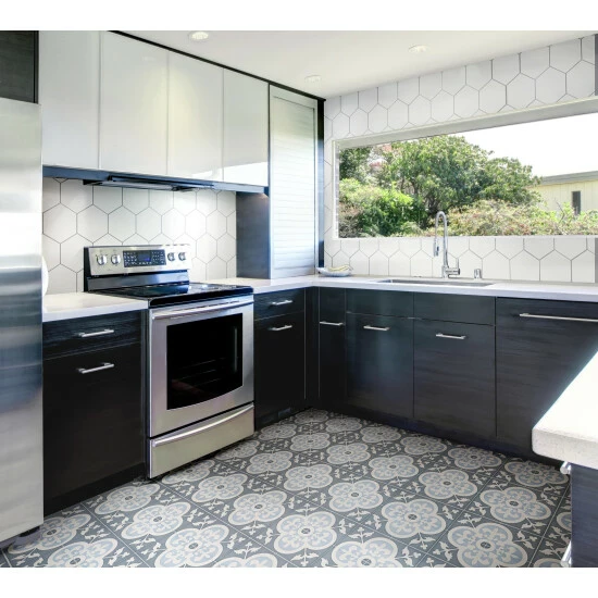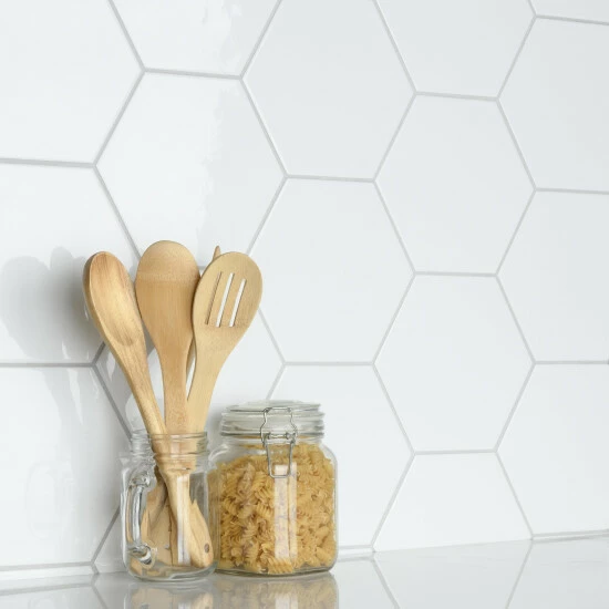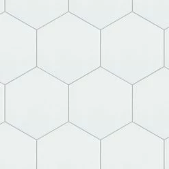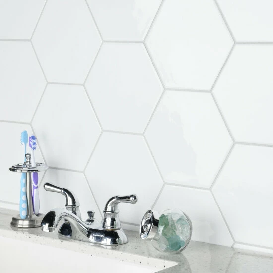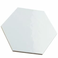 The Hexatile Glossy Blanco 7 in. x 8 in. Ceramic Wall Tile features a smooth, glossy finish. This hexagonal tile is perfect for any setting, traditional enough for historical renovations or modern enough for new construction. Easy to clean and versatile, these tiles are great for wall installations.