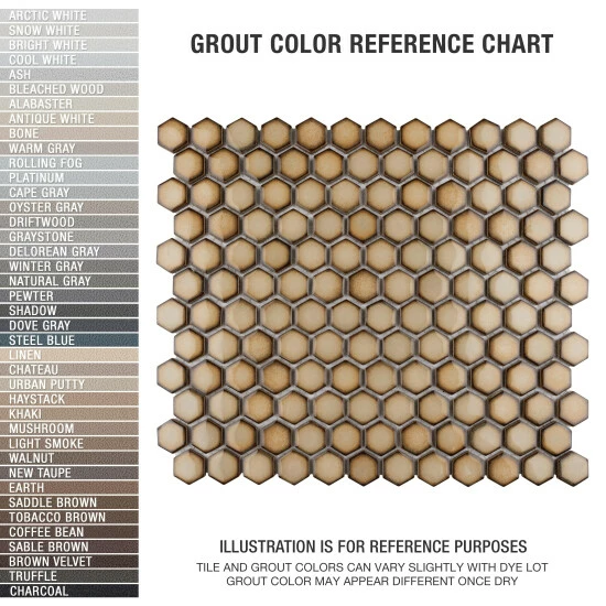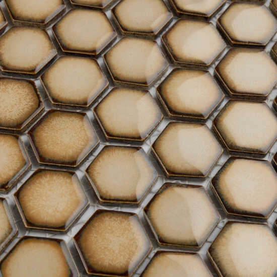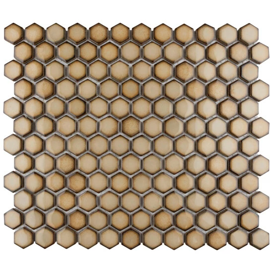 Our Hudson Hex 1″ Caffe Porcelain Mosaic Tile instantly elevates spaces through a refreshing dose of geometric design. With subtle variations in color tone that gradually fade to dark brown around the border, each piece is truly unique. Its rich reactive glaze echoes creamy beige hues with a high glossy finish that is unique yet simplistic enough to integrate into any design, ranging from traditional style renovations to modern home projects. Its impervious and frost-resistant features make this penny tile an ideal choice for indoor and outdoor floor and wall installations including, kitchen backsplashes, bathroom showers and accent walls. This hexagon tile can be used as a whole sheet or cut into smaller strips as an accent piece. It is a perfect choice on its own or coordinated with other colors in our Hudson Hex series. Tile is the better choice for your space. This tile is made from natural ingredients, making it a healthy choice as it is free from allergens, VOCs, formaldehyde, and PVC.