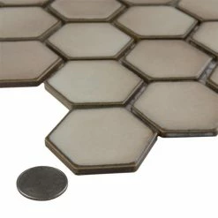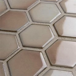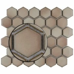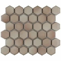 As a modern, enlarged deviation from the classic hexagon mosaic, our Hudson Due Hex 2 in. Truffle 12-1/2 in. x 11-1/4 in. Porcelain Mosaic Floor and Wall Tile instantly elevates spaces through a refreshing dose of geometric design. Featuring a reactive glaze with an eye-drop effect, these tiles have hues of soft beige that blend to taupe around the edges. This porcelain mosaic floor and wall tile creates a uniquely sporadic design through a pleasing mixture of warm-toned tints with additional dimension added by the smooth, high-gloss finish. Its impervious and frost-resistant features make this an ideal choice for both commercial and residential indoor and outdoor floor and wall installations including, kitchen backsplashes, bathroom showers and accent walls. This hexagon mosaic can be used as a whole sheet or cut into smaller strips as an accent piece. It is a perfect choice on its own or coordinated with other colors in our Hudson Due Hex series. Tile is the better choice for your space. This tile is made from natural ingredients, making it a healthy choice as it is free from allergens, VOCs, formaldehyde and PVC.