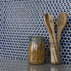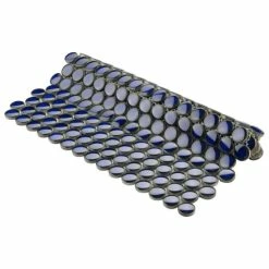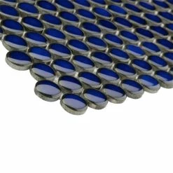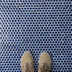 Our Hudson Penny Round Glossy Blue Eye 12 in. x 12-5/8 in. x 5 mm Porcelain Mosaic Tile lends a refreshing aesthetic to the classic penny round shape. With subtle variations in color tone that gradually fade to black around the border, each piece is truly unique. Its rich reactive glaze echoes light to dark blue hues with a high glossy finish that is unique yet simplistic enough to integrate into any design, ranging from traditional style renovations to modern home projects. Its impervious and frost-resistant features make this penny tile an ideal choice for indoor and outdoor floor and wall installations including, kitchen backsplashes, bathroom showers and accent walls. This penny round tile can be used as a whole sheet or cut into smaller strips as an accent piece. It is a perfect choice on its own or coordinated with other colors in our Hudson Penny Round series.