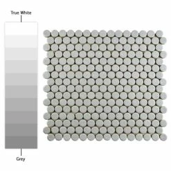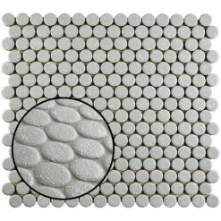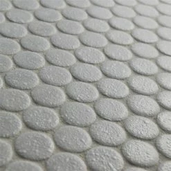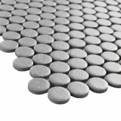Our Hudson Penny Round Crystalline Grey 12 in. x 12-5/8 in. x 5 mm Porcelain Mosaic Tile is a beautifully tranquil update on the timeless penny round design. Featuring a mottled glazed surface, these tiles have a muted grey color palette. This mosaic creates a classic and versatile look with additional dimension added by the raised smooth, high-gloss finish. Its impervious and frost-resistant features make this penny tile an ideal choice for indoor and outdoor floor and wall installations including, kitchen backsplashes, bathroom showers and accent walls. This penny round tile can be used as a whole sheet or cut into smaller strips as an accent piece. It is a perfect choice on its own or coordinated with other colors in our Hudson Penny Round series.