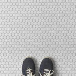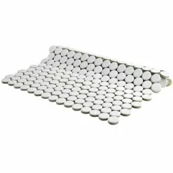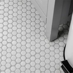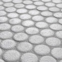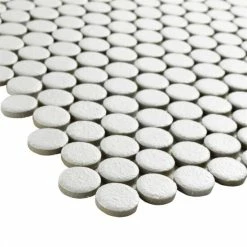 Our Hudson Penny Round Crystalline White 12 in. x 12-5/8 in. x 5 mm Porcelain Mosaic Tile is a beautifully tranquil update on the timeless penny round design. Featuring a mottled glazed surface, these tiles have a muted white color palette. This mosaic creates a classic and versatile look with additional dimension added by the raised smooth, high-gloss finish. Its impervious and frost-resistant features make this penny tile an ideal choice for indoor and outdoor floor and wall installations including, kitchen backsplashes, bathroom showers and accent walls. This penny round tile can be used as a whole sheet or cut into smaller strips as an accent piece. It is a perfect choice on its own or coordinated with other colors in our Hudson Penny Round series.