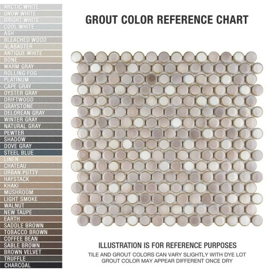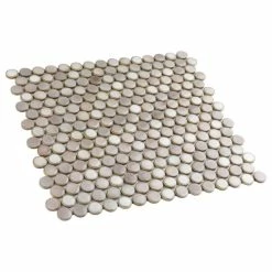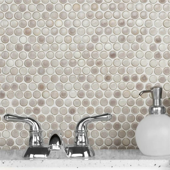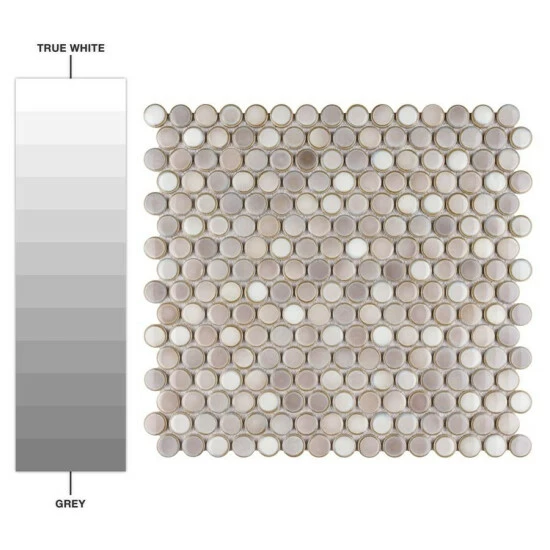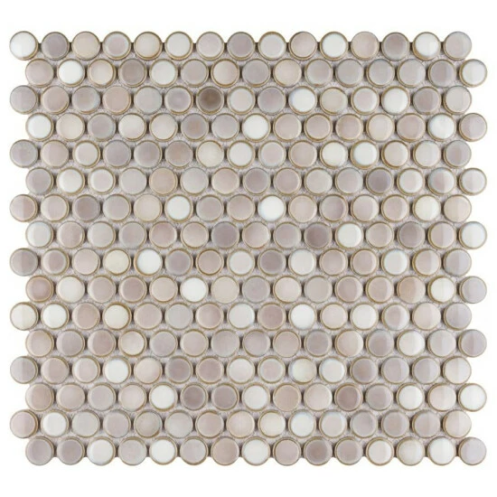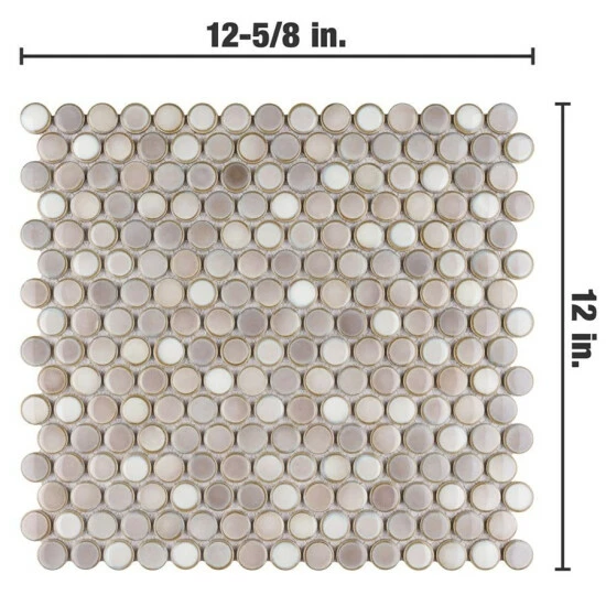 Our Hudson Penny Round Dove Grey 12 in. x 12-5/8 in. x 5 mm Porcelain Mosaic Tile is a beautifully tranquil update on the timeless penny round design. Featuring a reactive glaze with an eye-drop effect, these tiles have varying shades of grey that blend to taupe around the edges. This mosaic creates a uniquely sporadic design through a pleasing mixture of cool-toned tints with additional dimension added by the smooth, high-gloss finish. Its impervious and frost-resistant features make this penny tile an ideal choice for indoor and outdoor floor and wall installations including, kitchen backsplashes, bathroom showers and accent walls. This penny round tile can be used as a whole sheet or cut into smaller strips as an accent piece. It is a perfect choice on its own or coordinated with other colors in our Hudson Penny Round series.