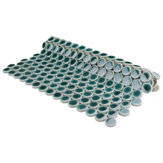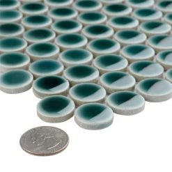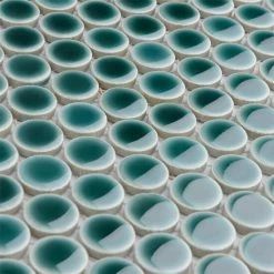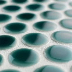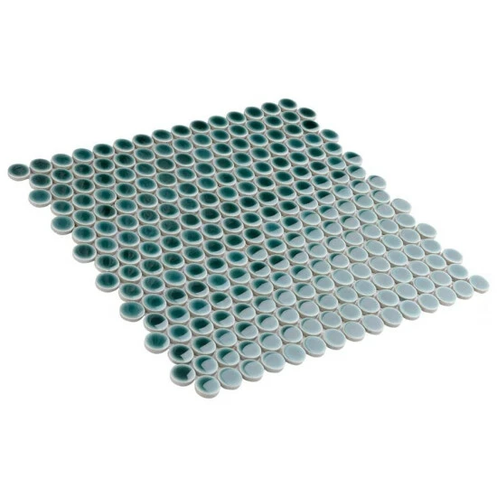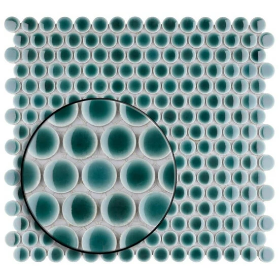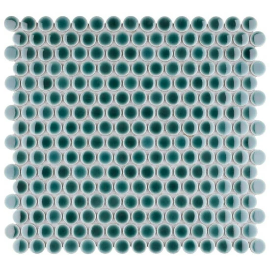 Our Hudson Penny Round Glossy Emerald 12 in. x 12-5/8 in. x 5 mm Porcelain Mosaic Tile lends a refreshing aesthetic to the classic penny round shape. With subtle variations in color tone that gradually fade to white around the border, each piece is truly unique. Its rich reactive glaze echoes deep emerald hues with a high glossy finish that is unique yet simplistic enough to integrate into any design, ranging from traditional style renovations to modern home projects. Its impervious and frost-resistant features make this penny tile an ideal choice for indoor and outdoor floor and wall installations including, kitchen backsplashes, bathroom showers and accent walls. This penny round tile can be used as a whole sheet or cut into smaller strips as an accent piece. It is a perfect choice on its own or coordinated with other colors in our Hudson Penny Round series.