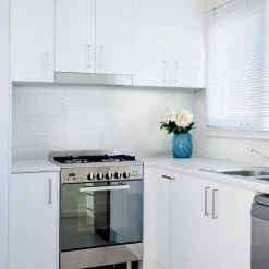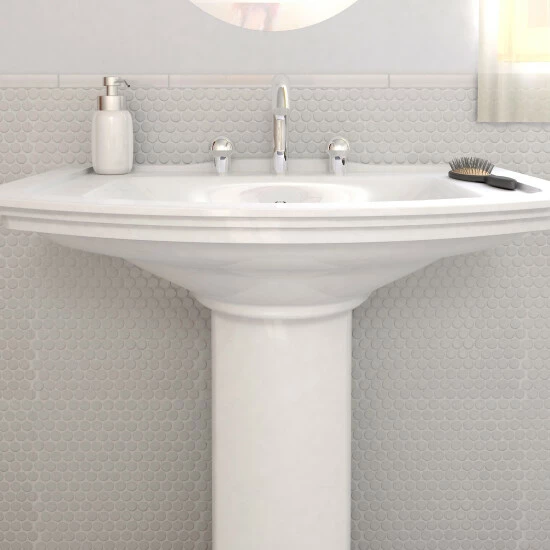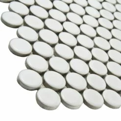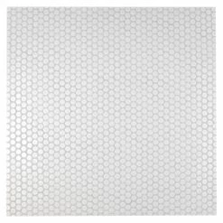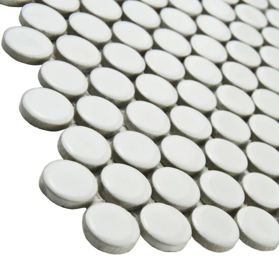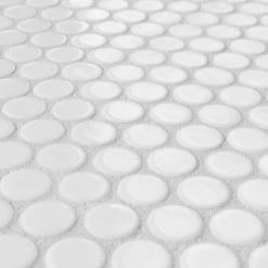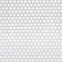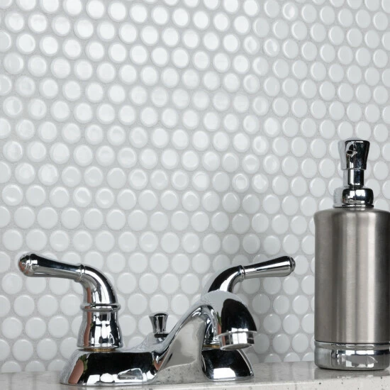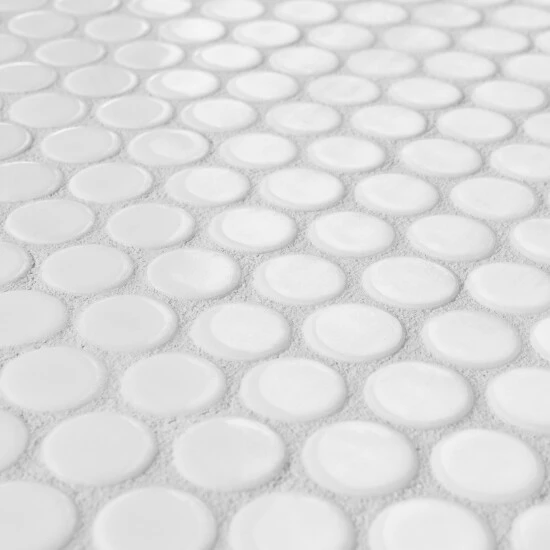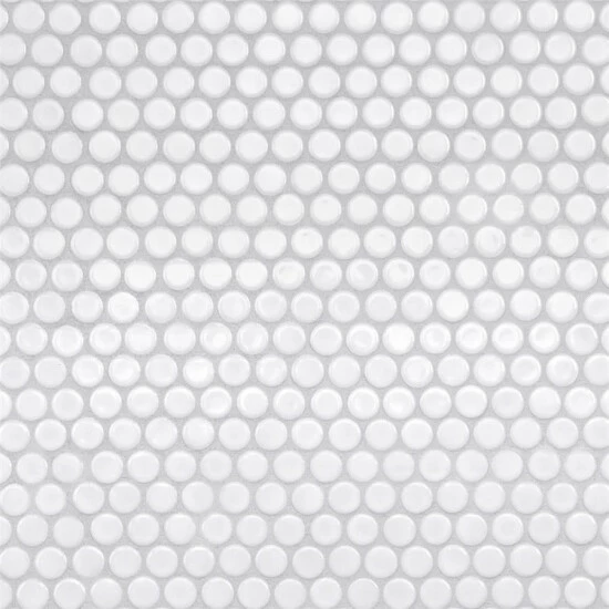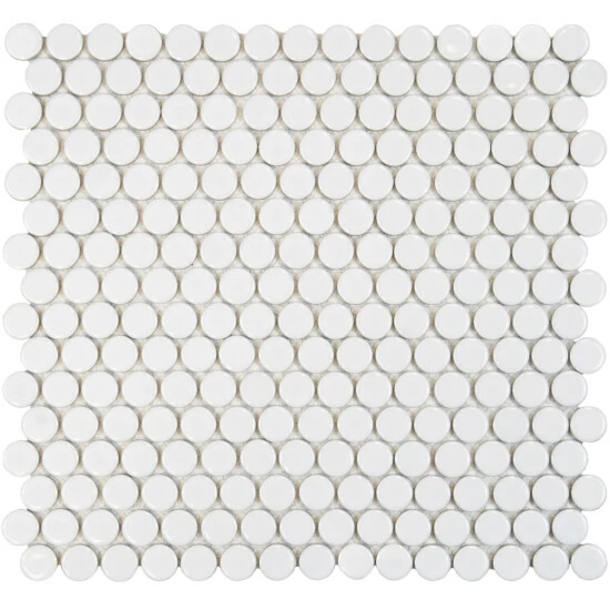 Our Hudson Penny Round Glossy White 12 in. x 12-5/8 in. x 5 mm Porcelain Mosaic Tile lends a refreshing aesthetic to the classic penny round shape. This mosaic tile features a uniformly glazed surface with a smooth texture and a glossy white color tone. It offers a versatile appearance that is unique yet simplistic enough to integrate into any design, ranging from traditional style renovations to modern home projects. Its impervious and frost-resistant features make this penny tile an ideal choice for indoor and outdoor floor and wall installations including, kitchen backsplashes, bathroom showers and accent walls. This penny round tile can be used as a whole sheet or cut into smaller strips as an accent piece. It is a perfect choice on its own or coordinated with other colors in our Hudson Penny Round series.