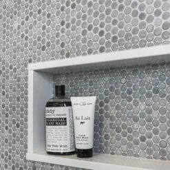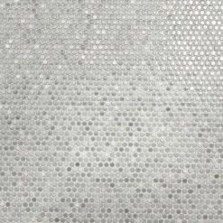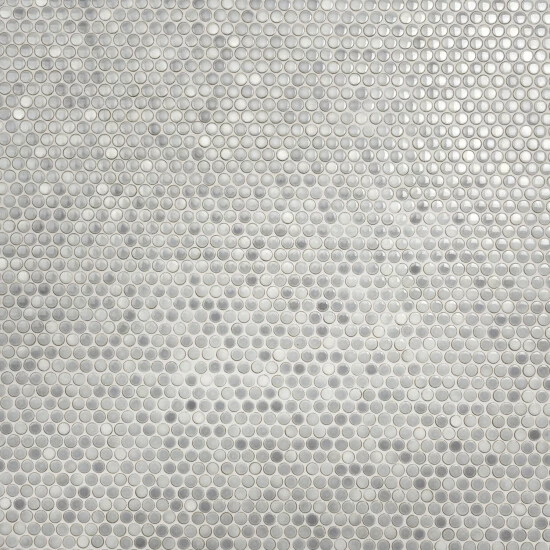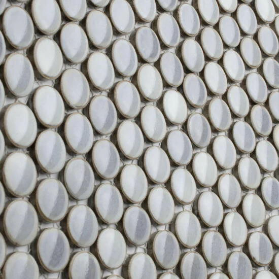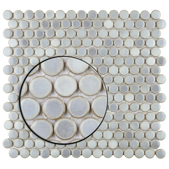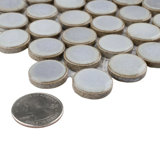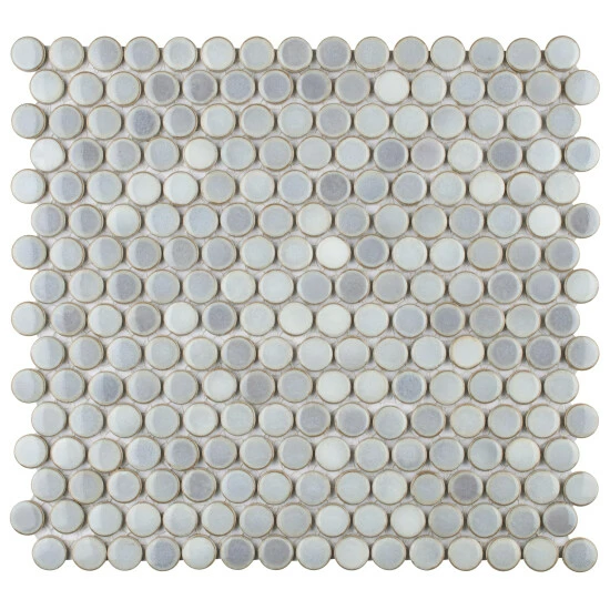 Our Hudson Penny Round Glossy Grey Eye 12 in. x 12-5/8 in. x 5 mm Porcelain Mosaic Tile lends a refreshing aesthetic to the classic penny round shape. With subtle variations in color tone that gradually fade to taupe around the border, each piece is truly unique. Its rich reactive glaze echoes light to dark grey hues with a high glossy finish that is unique yet simplistic enough to integrate into any design, ranging from traditional style renovations to modern home projects. Its impervious and frost-resistant features make this penny tile an ideal choice for indoor and outdoor floor and wall installations including, kitchen backsplashes, bathroom showers and accent walls. This penny round tile can be used as a whole sheet or cut into smaller strips as an accent piece. It is a perfect choice on its own or coordinated with other colors in our Hudson Penny Round series.