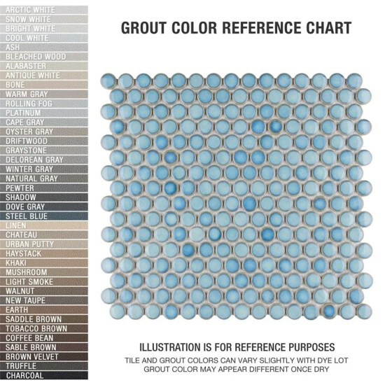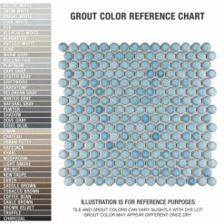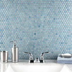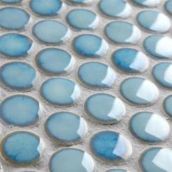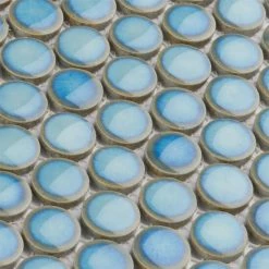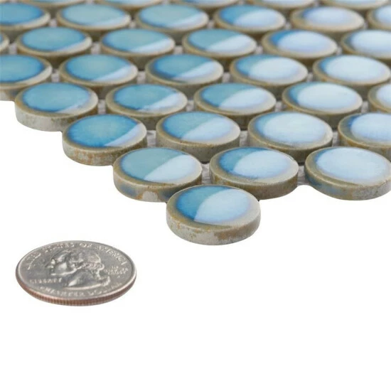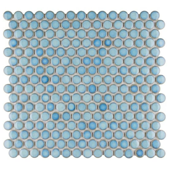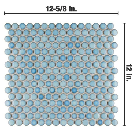 Our Hudson Penny Round Marine 12 in. x 12-5/8 in. x 5 mm Porcelain Mosaic Tile is a beautifully tranquil update on the timeless penny round design. Featuring a reactive glaze with an eye-drop effect, these tiles have varying shades of light and dark sky blue that blend to taupe around the edges. This mosaic creates a uniquely sporadic design through a pleasing mixture of cool-toned tints with additional dimension added by the smooth, high-gloss finish. Its impervious and frost-resistant features make this penny tile an ideal choice for indoor and outdoor floor and wall installations including, kitchen backsplashes, bathroom showers and accent walls. This penny round tile can be used as a whole sheet or cut into smaller strips as an accent piece. It is a perfect choice on its own or coordinated with other colors in our Hudson Penny Round series.