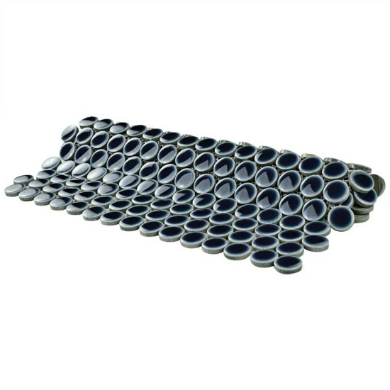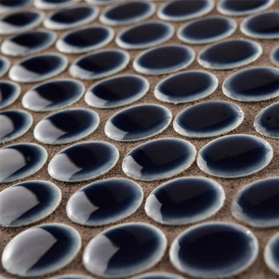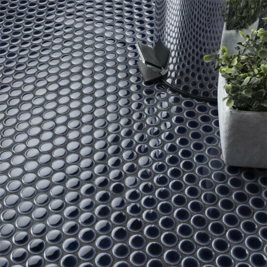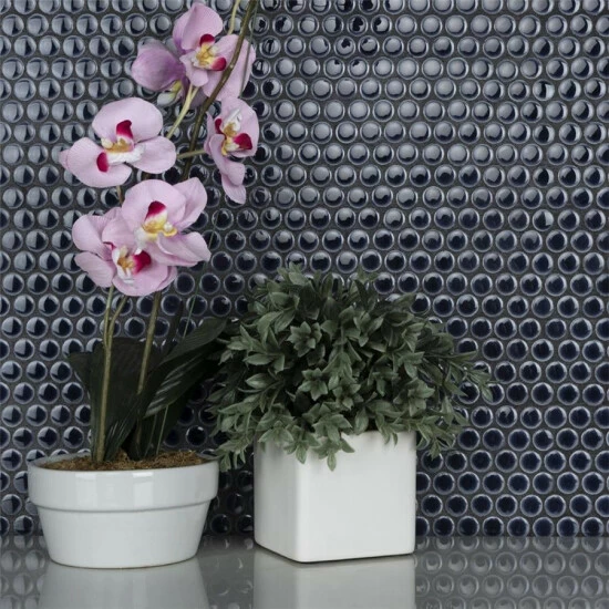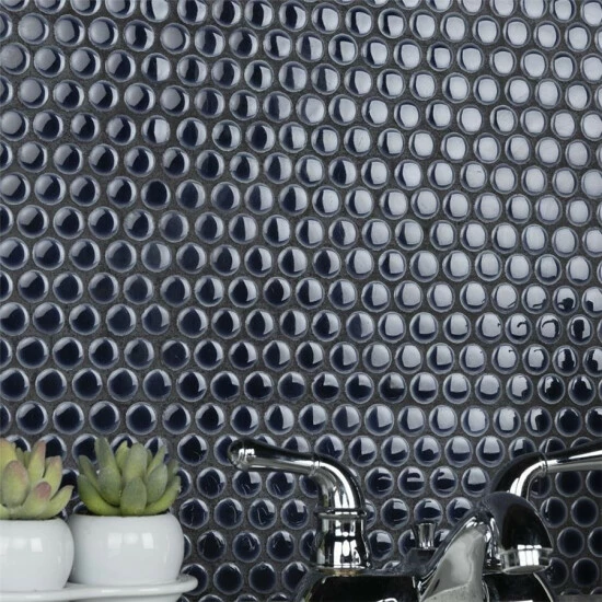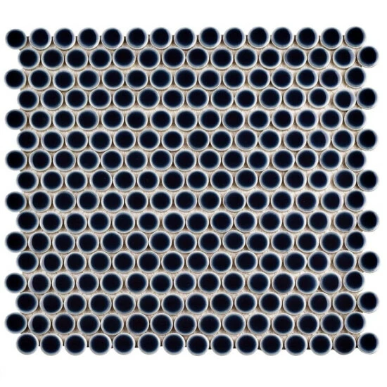 Our Hudson Penny Round Noir 12 in. x 12-5/8 in. x 5 mm Porcelain Mosaic Tile is a beautifully tranquil update on the timeless penny round design. Featuring a reactive glaze with an eye-drop effect, these tiles have hues of deep midnight blue that blend to white around the edges. This mosaic creates a uniquely sporadic design through a pleasing mixture of cool-toned tints with additional dimension added by the smooth, high-gloss finish. Its impervious and frost-resistant features make this penny tile an ideal choice for indoor and outdoor floor and wall installations including, kitchen backsplashes, bathroom showers and accent walls. This penny round tile can be used as a whole sheet or cut into smaller strips as an accent piece. It is a perfect choice on its own or coordinated with other colors in our Hudson Penny Round series.