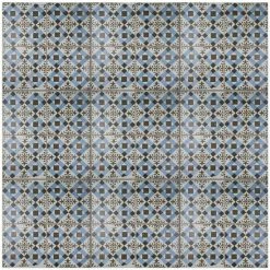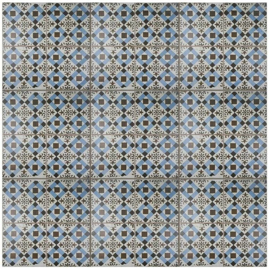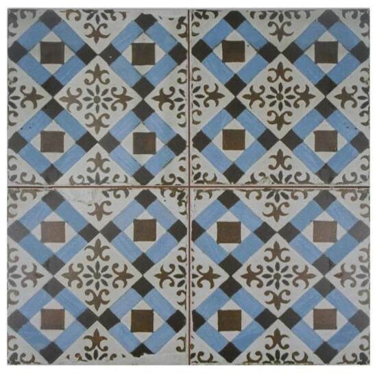 Old-world European elegance radiates from our Kings Millbasin 17-5/8 in. x 17-5/8 in. Ceramic Floor and Wall Tile, imported from Spain. Save time and labor spent arranging smaller square tiles and instead install these durable ceramic slabs, which have four 8-3/4 in. squares separated by scored grout lines. The defining feature on this encaustic-inspired tile is the unique, low-sheen glaze in chocolate brown and sky blue, adorned with floral patterns and squares that have a distinctive hand-painted look. Designed by interior architect and furniture designer Francisco Segarra, this tile is a true reflection of vintage industrial design. Imitations of scuffs and spots that are the marks of well-loved, worn, century-old tile bring rustic charm to your interior. There are 5 different variations available that are randomly scattered throughout each case. The scored grout lines can be grouted with the color of your choice to further customize your installation.