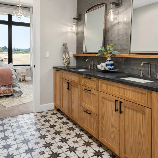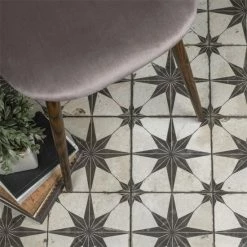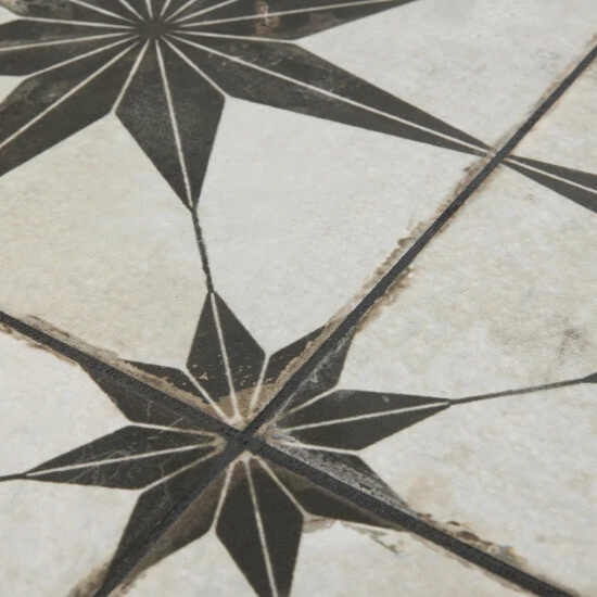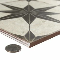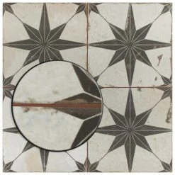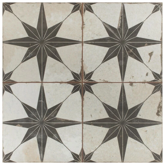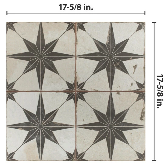 Old-world European elegance radiates from our Kings Star Nero 17-5/8 in. x 17-5/8 in. Ceramic Floor and Wall Tile, imported from Spain. Save time and labor spent arranging smaller square tiles and instead install these durable ceramic slabs, which have four 8-3/4 in. squares separated by scored grout lines. The defining feature of this encaustic-inspired tile is the unique, low-sheen glaze in beige tones with centered black stars in each square. Variation throughout each tile mimics an authentic aged appearance. Designed by interior architect and furniture designer Francisco Segarra, this tile is a true reflection of vintage industrial design. Realistic imitations of scuffs and spots that are the marks of well-loved, worn, century-old tile bring rustic charm to your interior. These rustic scuffs and spots convince that this tile is truly aged. There are 9 different variations available that are randomly scattered throughout each case. The scored grout lines can be grouted with the color of your choice to further customize your installation.