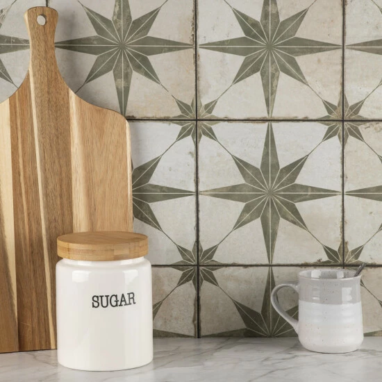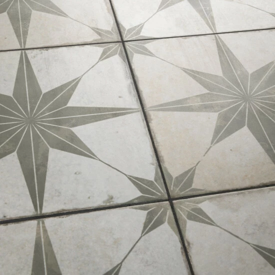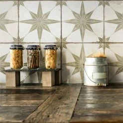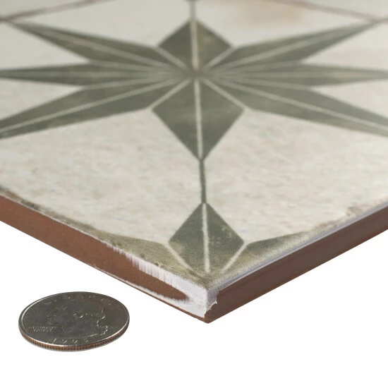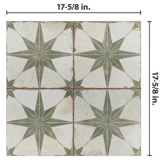 Old-world European elegance radiates from our Kings Star Sage 17-5/8 in. x 17-5/8 in. Ceramic Floor and Wall Tile, imported from Spain. Save time and labor spent arranging smaller square tiles and instead install these durable ceramic slabs, which have four 8-3/4 in. squares separated by scored grout lines. The defining feature of this encaustic-inspired tile is the unique, low-sheen glaze in beige tones with centered sage green stars in each square. Variation throughout each tile mimics an authentic aged appearance. Designed by interior architect and furniture designer Francisco Segarra, this tile is a true reflection of vintage industrial design. Realistic imitations of scuffs and spots that are the marks of well-loved, worn, century-old tile bring rustic charm to your interior. These rustic scuffs and spots convince that this tile is truly aged. There are 9 different variations available that are randomly scattered throughout each case. The scored grout lines can be grouted with the color of your choice to further customize your installation. Tile is the better choice for your space. This tile is made from natural ingredients, making it a healthy choice as it is free from allergens, VOCs, formaldehyde and PVC.