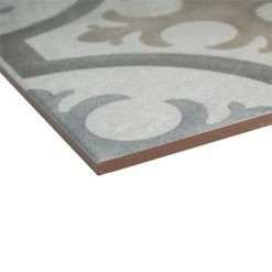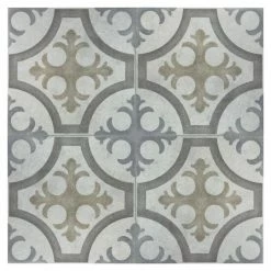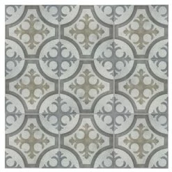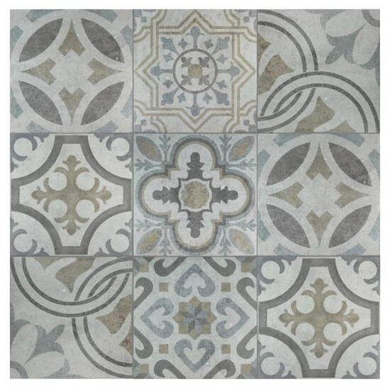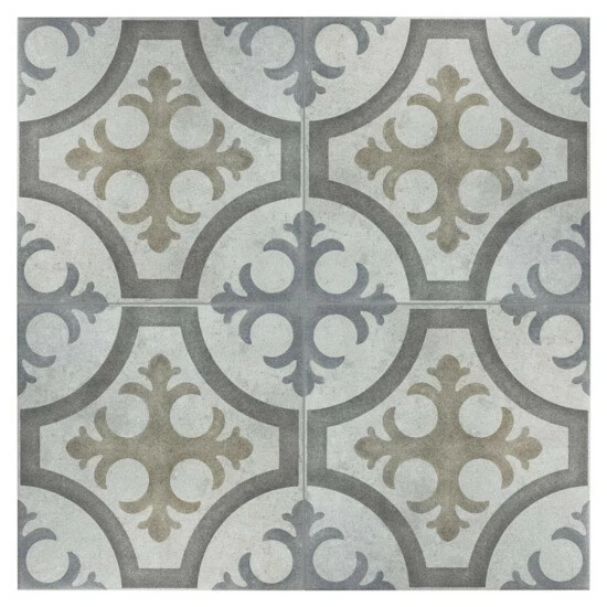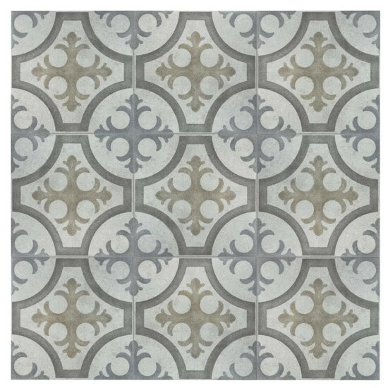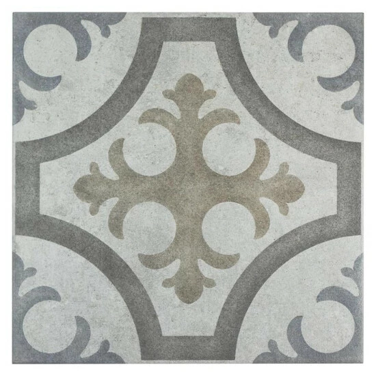 Drawing inspiration from aged cement tiles, the Llanes Perla Marbella Encaustic 13-1/8 in. x 13-1/8 in. Ceramic Floor and Wall Tile brings a subdued encaustic look to your space. Featuring an old-world pattern in muted brown, grey and blue tones, this Spanish tile offers an authentic, worn feel. With a slightly textured matte glaze, these tiles have a distressed, weathered look including slight chemical-splashed spotting and sporadic splashes of glossy glazing which reflect light. The speckled coloring throughout each tile mimics the appearance of cement. Use this tile alone for a continuous pattern or pair with other tiles in the Llanes Perla Collection for a unique installation. The mid-level durability rating makes these suitable for most interior installations, including showers, kitchens and entryways.