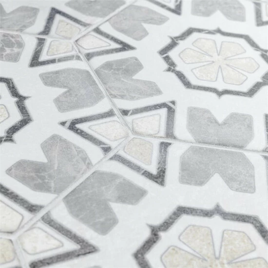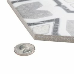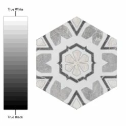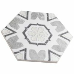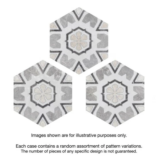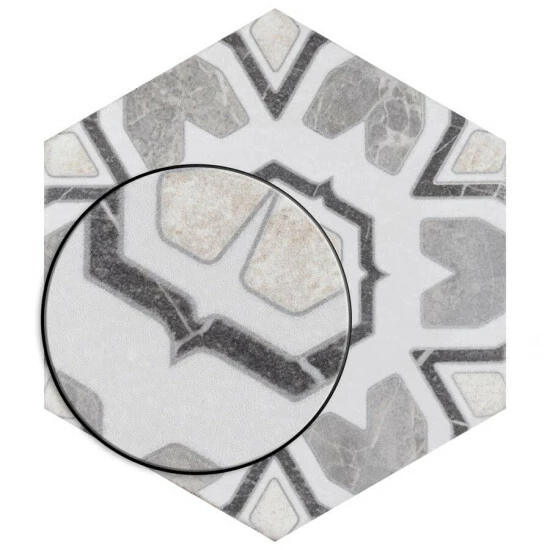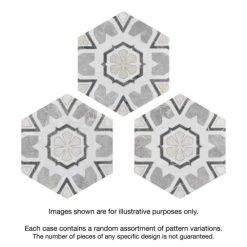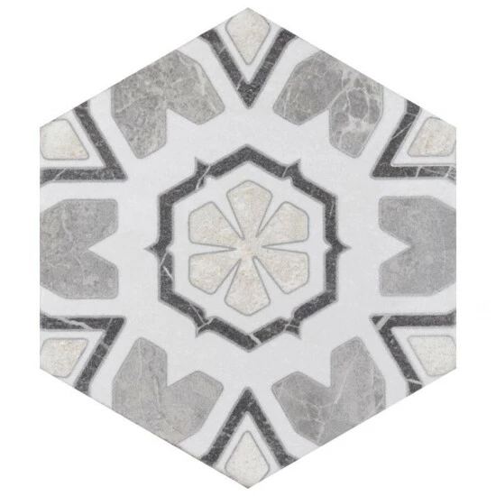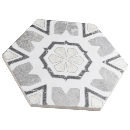Combining modern and vintage design elements, our Mazzo Hex Deco Chroma Porcelain Floor and Wall Tile offers the rustic appearance of natural stone and the timeless beauty of marble. This porcelain hexagon tile features floral and geometric motifs in faded shades of charcoal grey, beige and light grey. Set on a muted, matte grey-white glaze backdrop, the contrasting design is complemented with natural mineral-like pattern variations and veining striations that varies for added authenticity. Composed of rich detail and a smooth slip-resistant surface, this unique porcelain tile offers decorative, rustic beauty through realistic scuffs and spots that are the marks of well-loved, worn, century-old tile. This innovative and sophisticated display of geometric design is visually appealing and versatile, and adapts to any stylistic context. Its impervious, frost-resistant and durable features make this an ideal choice for both commercial and residential indoor and outdoor installations including, kitchens, bathrooms, backsplashes, showers, hallways, entryways, patios and fireplace facades. This tile is a perfect choice on its own or paired with other products in the Mazzo Hex Collection. Tile is the better choice for your space. This tile is made from natural ingredients, making it a healthy choice as it is free from allergens, VOCs, formaldehyde and PVC.