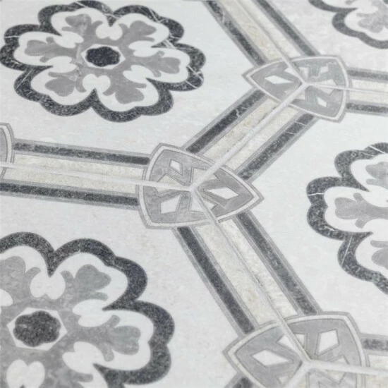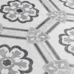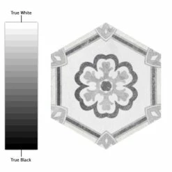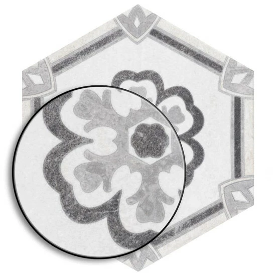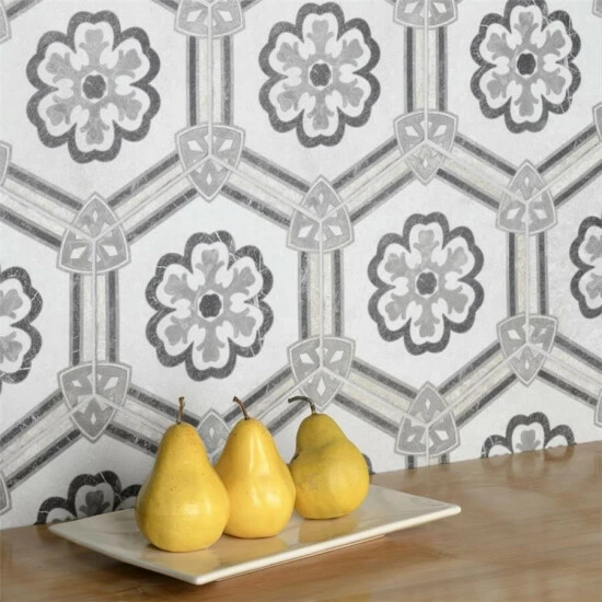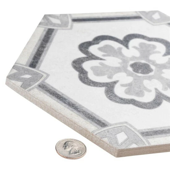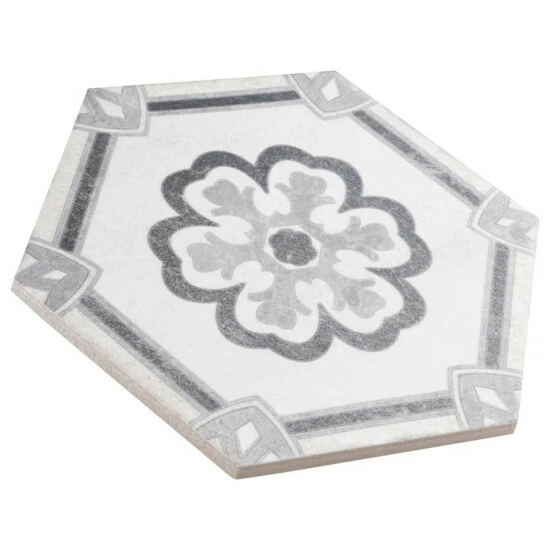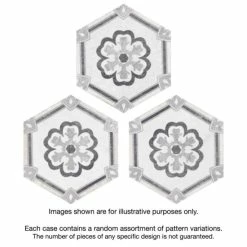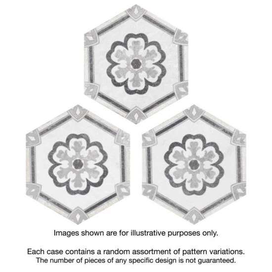 Our Mazzo Hex Deco Lily Pad 8-1/2″ x 9-3/4″ Porcelain Floor and Wall Tile replicates the rustic appearance of natural stone and the timeless beauty of marble. This porcelain hexagon tile features floral and geometric motifs in faded shades of charcoal grey, beige and light grey. Set on a muted, matte grey-white glaze backdrop, the contrasting design is complemented with natural mineral-like pattern variations and veining striations that varies for added authenticity. Composed of rich detail and a smooth slip-resistant surface, this unique porcelain tile offers decorative, rustic beauty through realistic scuffs and spots that are the marks of well-loved, worn, century-old tile. This innovative and sophisticated display of geometric design is visually appealing and versatile, and adapts to any stylistic context. Its impervious, frost-resistant and durable features make this an ideal choice for both commercial and residential indoor and outdoor installations including, kitchens, bathrooms, backsplashes, showers, hallways, entryways, patios and fireplace facades. This tile is a perfect choice on its own or paired with other products in the Mazzo Hex Collection. Tile is the better choice for your space. This tile is made from natural ingredients, making it a healthy choice as it is free from allergens, VOCs, formaldehyde and PVC.