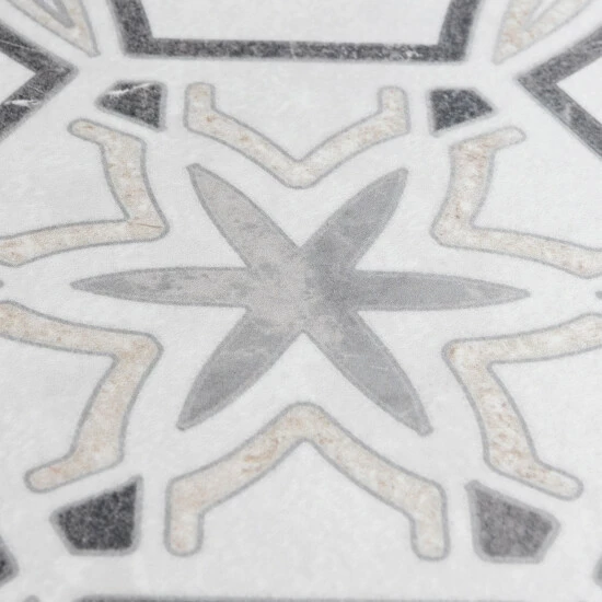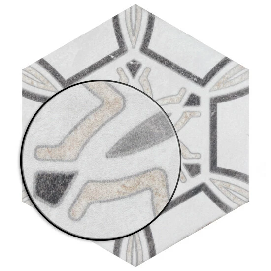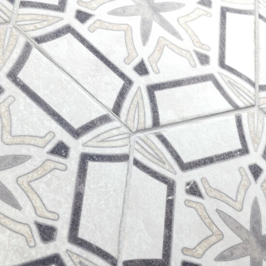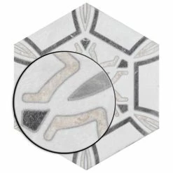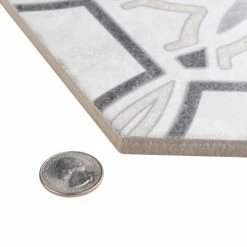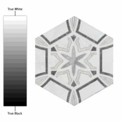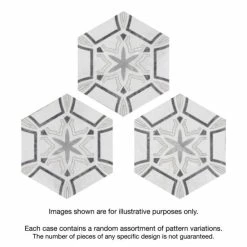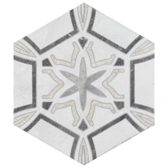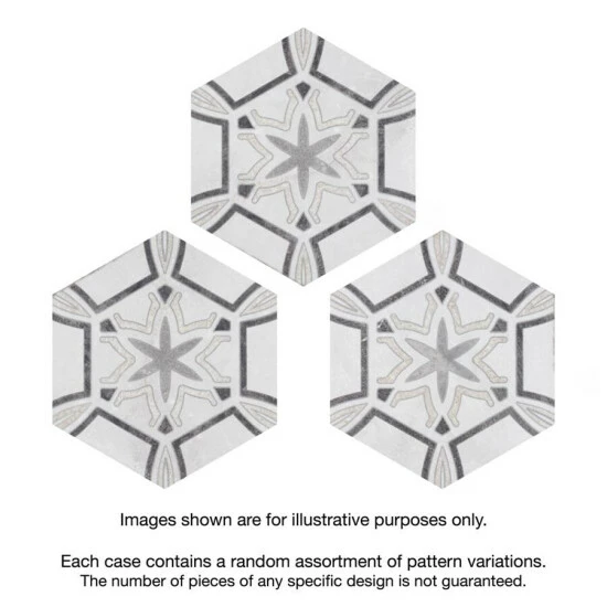 Capturing the appearance of natural stone and marble, our Mazzo Hex Deco Starburst 8-1/2″ x 9-3/4″ Porcelain Floor and Wall Tile offers timeless, rustic beauty. This porcelain hexagon tile features floral and geometric motifs in faded shades of charcoal grey, beige and light grey. Set on a muted, matte grey-white glaze backdrop, the contrasting design is complemented with natural mineral-like pattern variations and veining striations that varies for added authenticity. Composed of rich detail and a smooth slip-resistant surface, this unique porcelain tile offers decorative, rustic beauty through realistic scuffs and spots that are the marks of well-loved, worn, century-old tile. This innovative and sophisticated display of geometric design is visually appealing and versatile, and adapts to any stylistic context. Its impervious, frost-resistant and durable features make this an ideal choice for both commercial and residential indoor and outdoor installations including, kitchens, bathrooms, backsplashes, showers, hallways, entryways, patios and fireplace facades. This tile is a perfect choice on its own or paired with other products in the Mazzo Hex Collection. Tile is the better choice for your space. This tile is made from natural ingredients, making it a healthy choice as it is free from allergens, VOCs, formaldehyde and PVC.