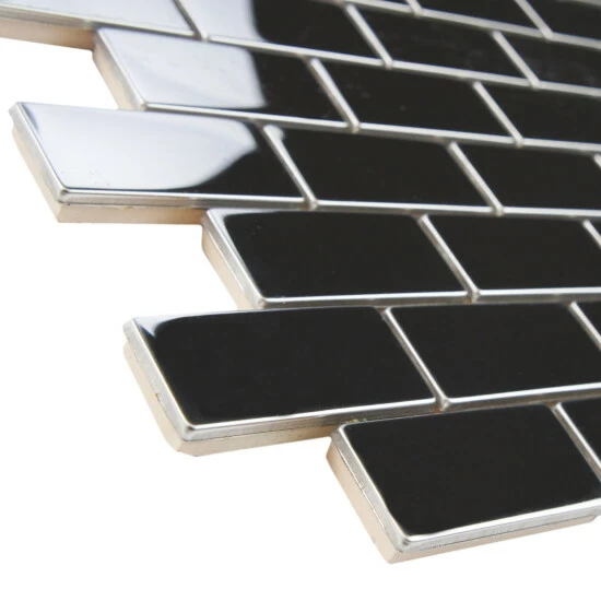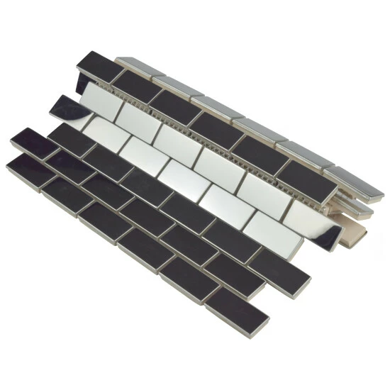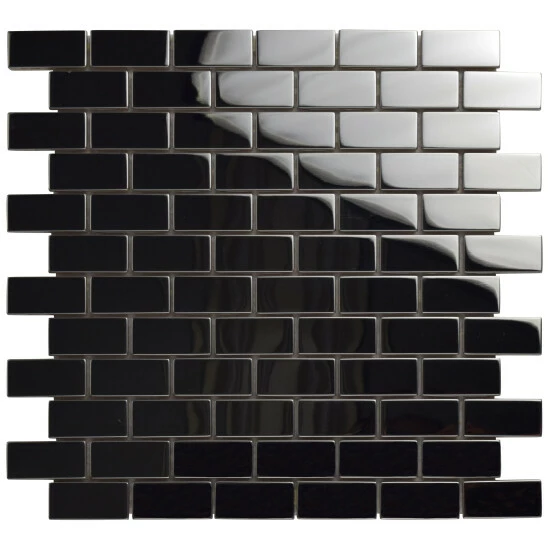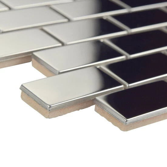 The Meta Standard Subway Mirrored 11-3/4 in. x 11-3/4 in. x 8 mm Stainless Steel Metal Over Ceramic Mosaic Tile adds sleek, contemporary style and charisma to almost any space. Each individual tile is approximately 1 in. x 2 in. and features a high-sheen, unique, mirrored-metal finish. Use non-sanded grout and plastic tools (sold separately) during installation to help prevent the tile from scratching. This tile is designed for indoor wall use, perfect for a modern kitchen backsplash or strip accent with glass mosaic tiles.
