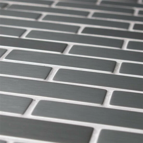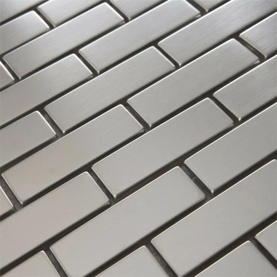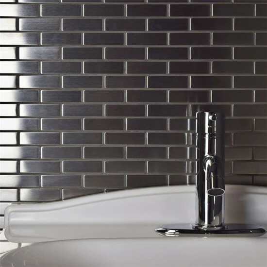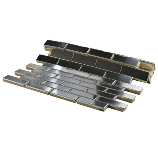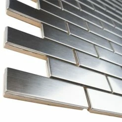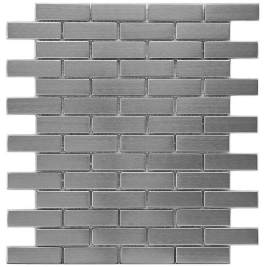 Sleek, contemporary design radiates from the Meta Subway 10-1/2 in. x 12-1/4 in. x 8mm Stainless Steel Metal Over Ceramic Mosaic Tile. With a timeless subway design in a miniature format, this metallic mosaic features a reflective, brushed-metal finish. The brushed metal veneer is adhered to a durable ceramic base for stress-free installation. Constructed of Grade 304 stainless steel, this durable steel is fabricated from the same material used in commercial kitchens, making it an excellent choice for a backsplash, shower or accent wall. When installing this tile, be sure to use unsanded grout and new plastic tools, including a float, sponge and bucket. Use this as a unified look or pair with the other Meta products for a custom, lustrous design.