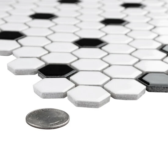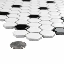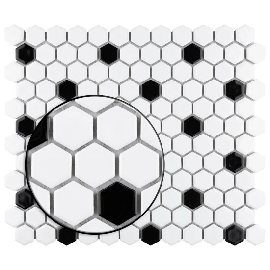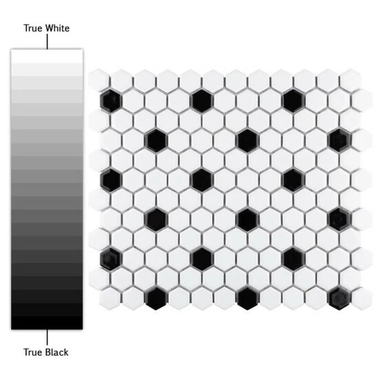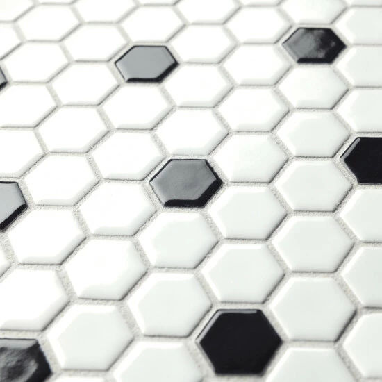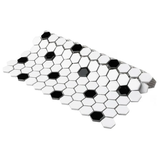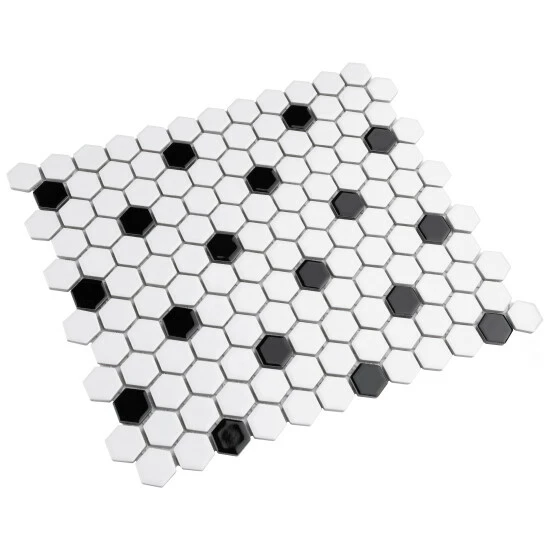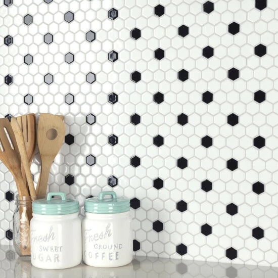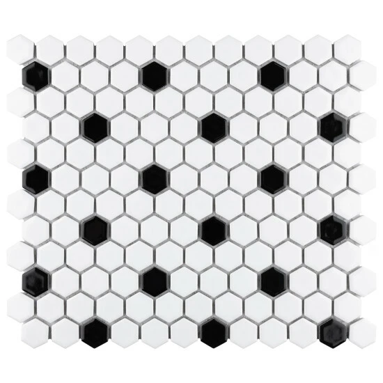 Transform your space into a tribute to retro design with our Metro Hex Glossy White with Black Dot 10-1/4 in. x 11-3/4 in. Porcelain Mosaic Floor and Wall Tile. As a modern deviation from the classic hexagon mosaic, this tile option is a throwback to traditional retro design with a contemporary feel. Glossy white hexagons are accented by contrasting black chips and precisely arranged on an interlocking mesh to create a seamless installation. This minimalistic geometric porcelain mosaic is unique yet simplistic enough to integrate into any design, ranging from traditional style renovations to modern home projects. Its impervious and frost-resistant features make this an ideal tile for both indoor and outdoor residential use, including backsplashes, bathrooms, showers and kitchens. This tile is a perfect choice on its own or paired with other products in the Metro Hex Collection. Tile is the better choice for your space. This tile is made from natural ingredients, making it a healthy choice as it is free from allergens, VOCs, formaldehyde and PVC.