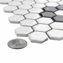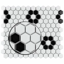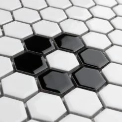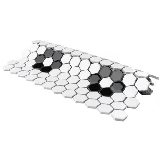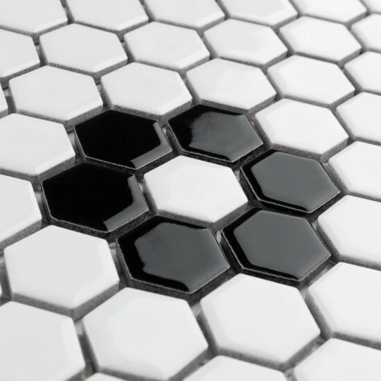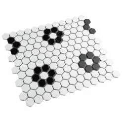 Transform your space into a tribute to retro design with our Metro Hex Glossy White with Flower 10-1/4″ x 11-7/8″ Porcelain Floor and Wall Mosaic Tile. As a modern deviation from the classic mosaic, this fresh option is a throwback to traditional retro design with a contemporary feel. Glossy white hexagons are accented by contrasting glossy black hexagons arranged into the shape flowers on an interlocking mesh to create a seamless installation. This minimalistic geometric porcelain mosaic is unique yet simplistic enough to integrate into any design, ranging from traditional style renovations to modern home projects. Its impervious and frost-resistant features make this an ideal tile for both indoor and outdoor residential use, including backsplashes, bathrooms, showers, kitchens and fireplace facades. This tile is a perfect choice on its own or paired with other products in the Metro Collection. Tile is the better choice for your space. This tile is made from natural ingredients, making it a healthy choice as it is free from allergens, VOCs, formaldehyde and PVC.