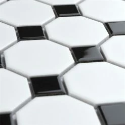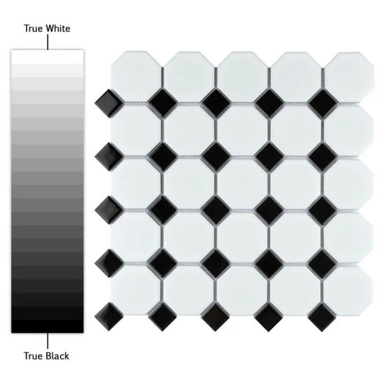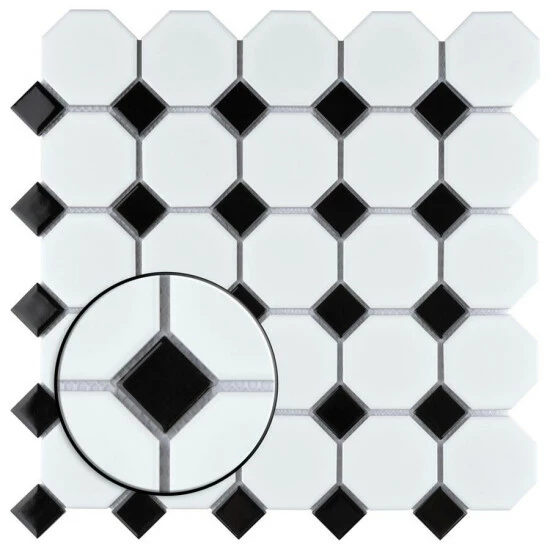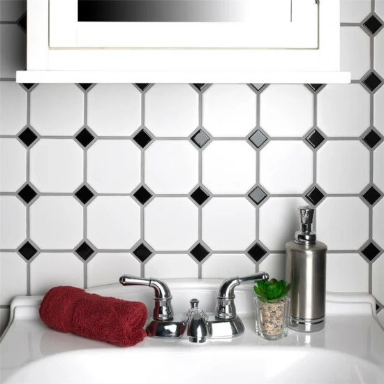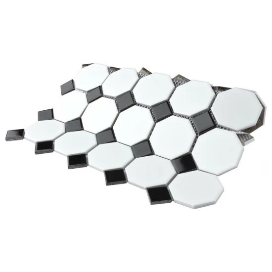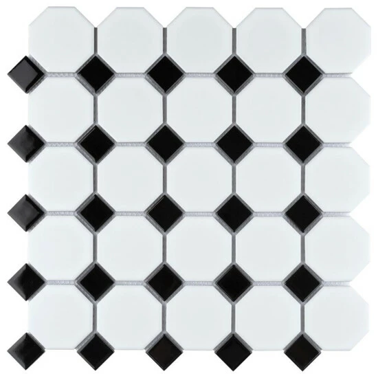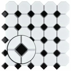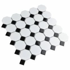 Transform your space into a tribute to retro design with our Metro Octagon Matte White with Black Dot 11-1/2″ x 11-1/2″ Porcelain Mosaic Floor and Wall Tile. As a modern deviation from the classic mosaic, this tile option is a throwback to traditional retro design with a contemporary feel. Matte white octagons are accentuated by small glossy black squares and precisely arranged on an interlocking mesh to create a seamless installation. This minimalistic geometric porcelain mosaic is unique yet simplistic enough to integrate into any design, ranging from traditional style renovations to modern home projects. Its impervious and frost-proof features make this an ideal tile for indoor and outdoor installations, including backsplashes, bathrooms, showers and kitchens. Tile is the better choice for your space. This tile is made from natural ingredients, making it a healthy choice as it is free from allergens, VOCs, formaldehyde and PVC. Β